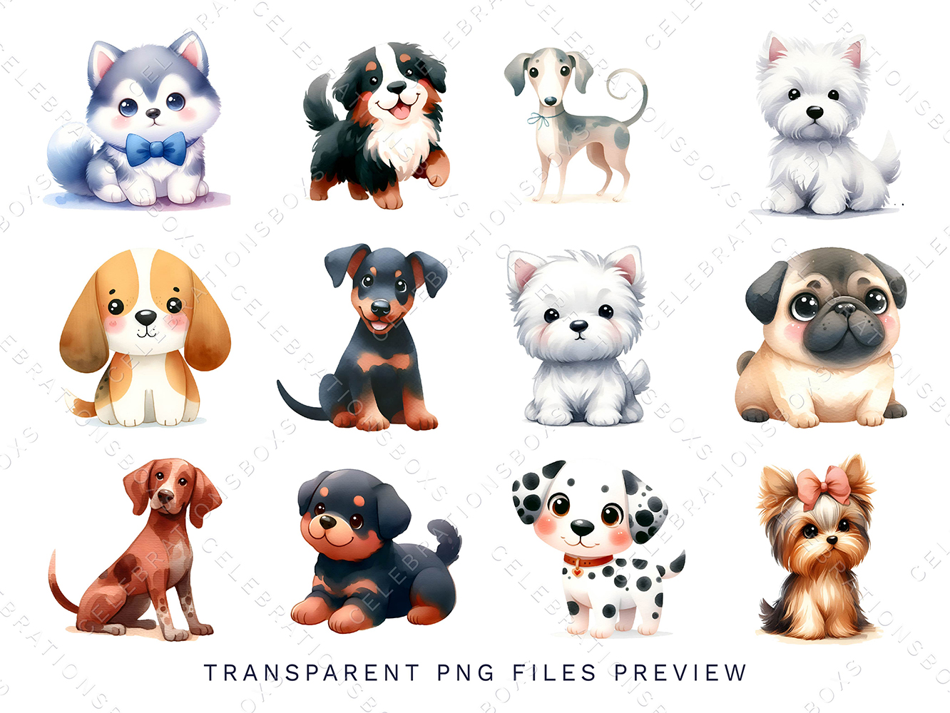This high quality Watercolor Puppy Clipart is easy to print and Perfect for greeting cards, party decorations, mug sublimation, t-shirt sublimation, invitation cards, cupcake toppers, junk journaling, stickers, scrapbooking, stationary, gift warp, embroidery, printed fabrics, poster, banner and so much more!