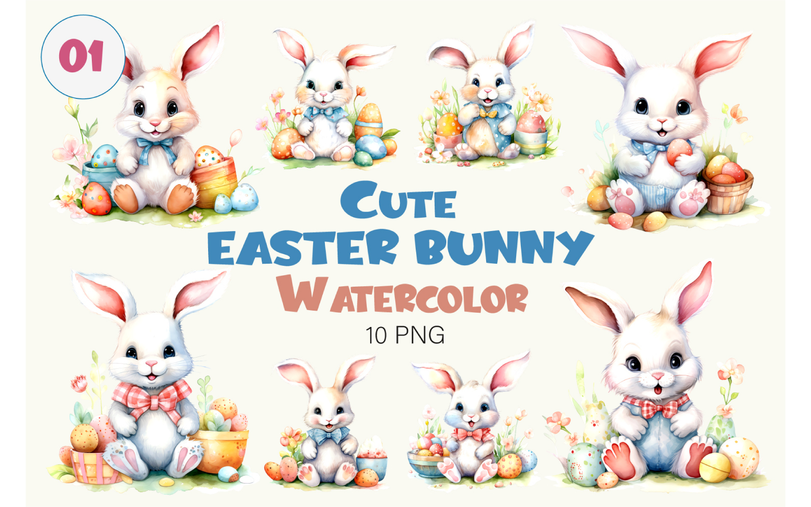 Set of Cute Easter bunnies 01, only 10 pieces. Illustration of the Easter bunny sitting in a clearing with Easter eggs. Use the product to print on clothing, t-shirts, labels and stickers, nursery decorations, invitation cards, scrapbooking, journals and more.