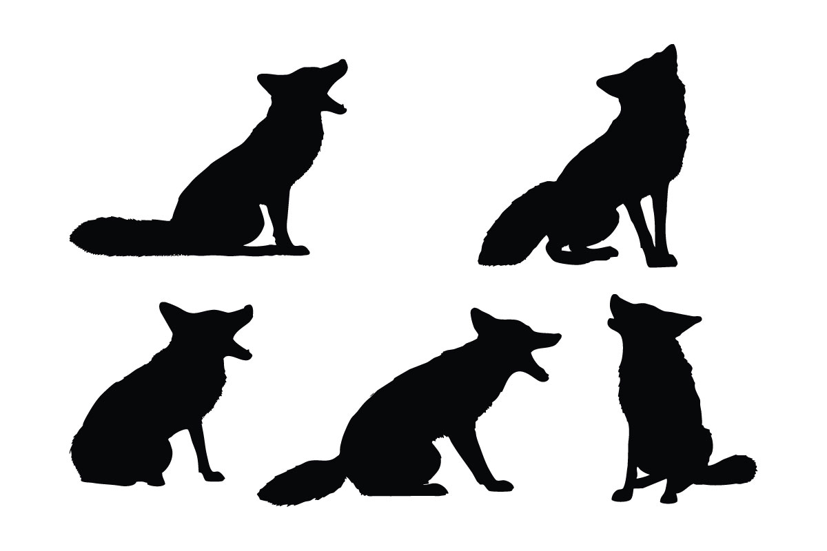 Cute foxes sitting silhouette vector. Wild foxes sitting silhouette set vector on a white background. Carnivore wild fox silhouette bundle design. Fox sitting and howling in different positions. Jackal full body silhouette collection.