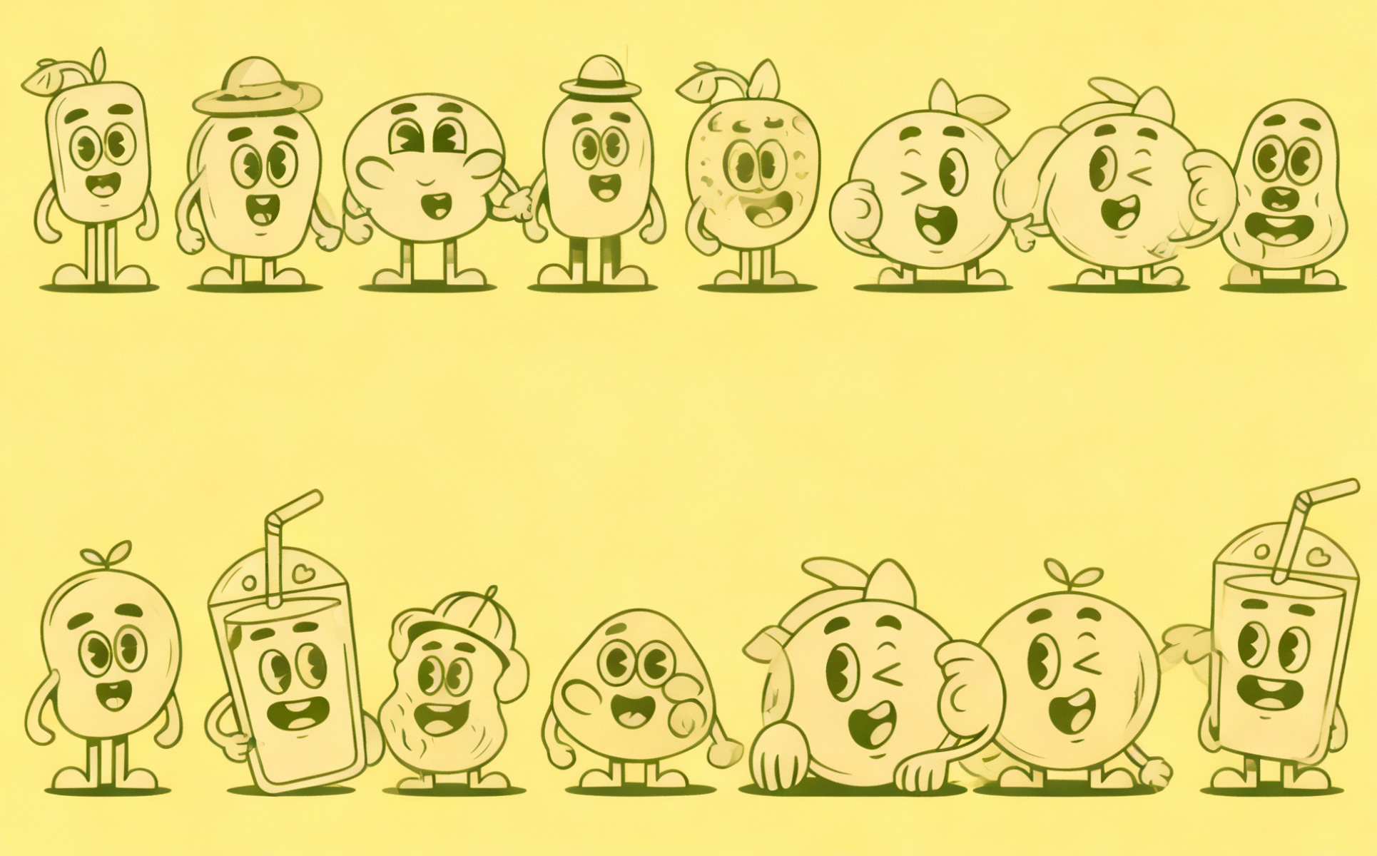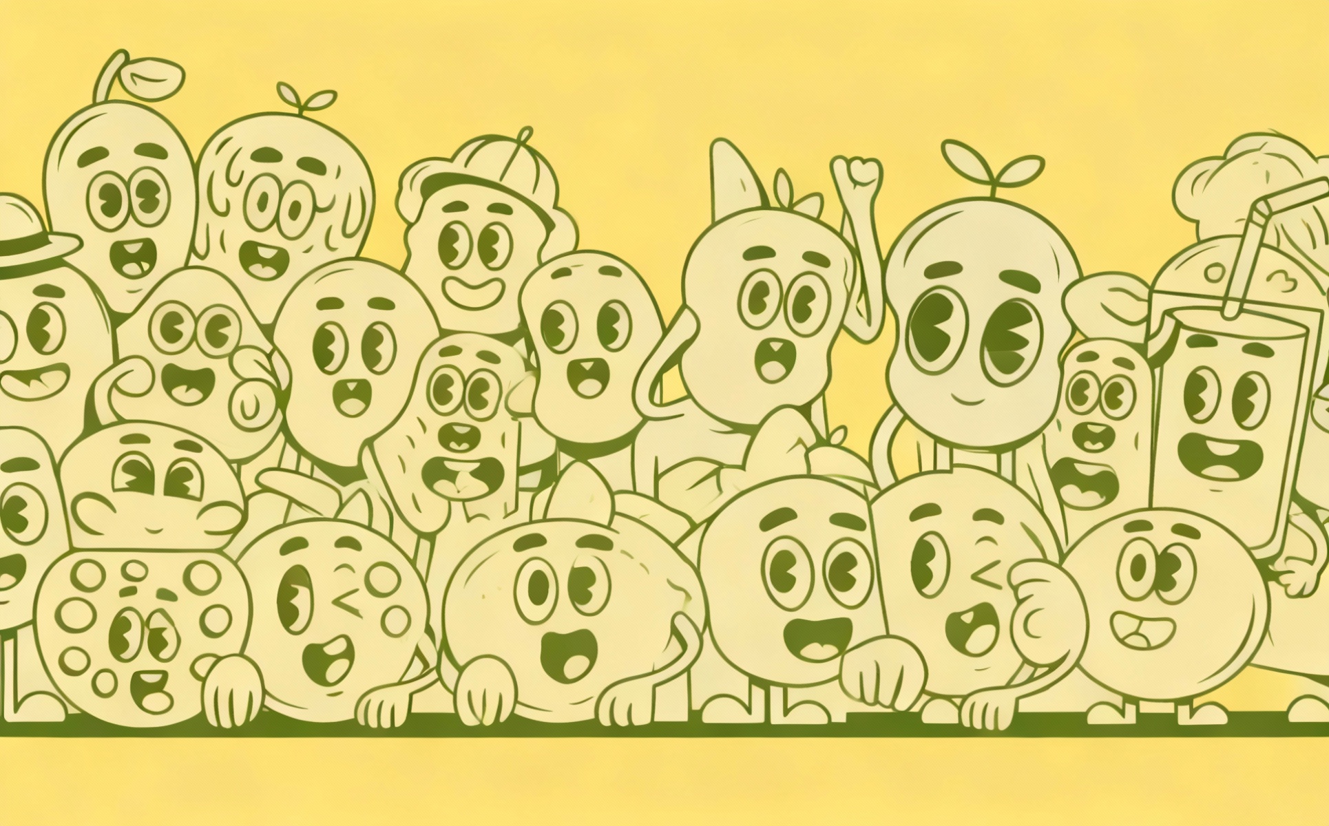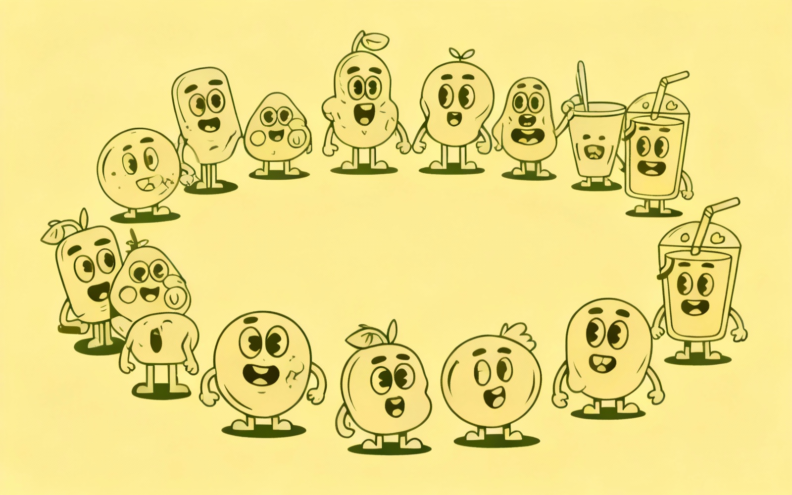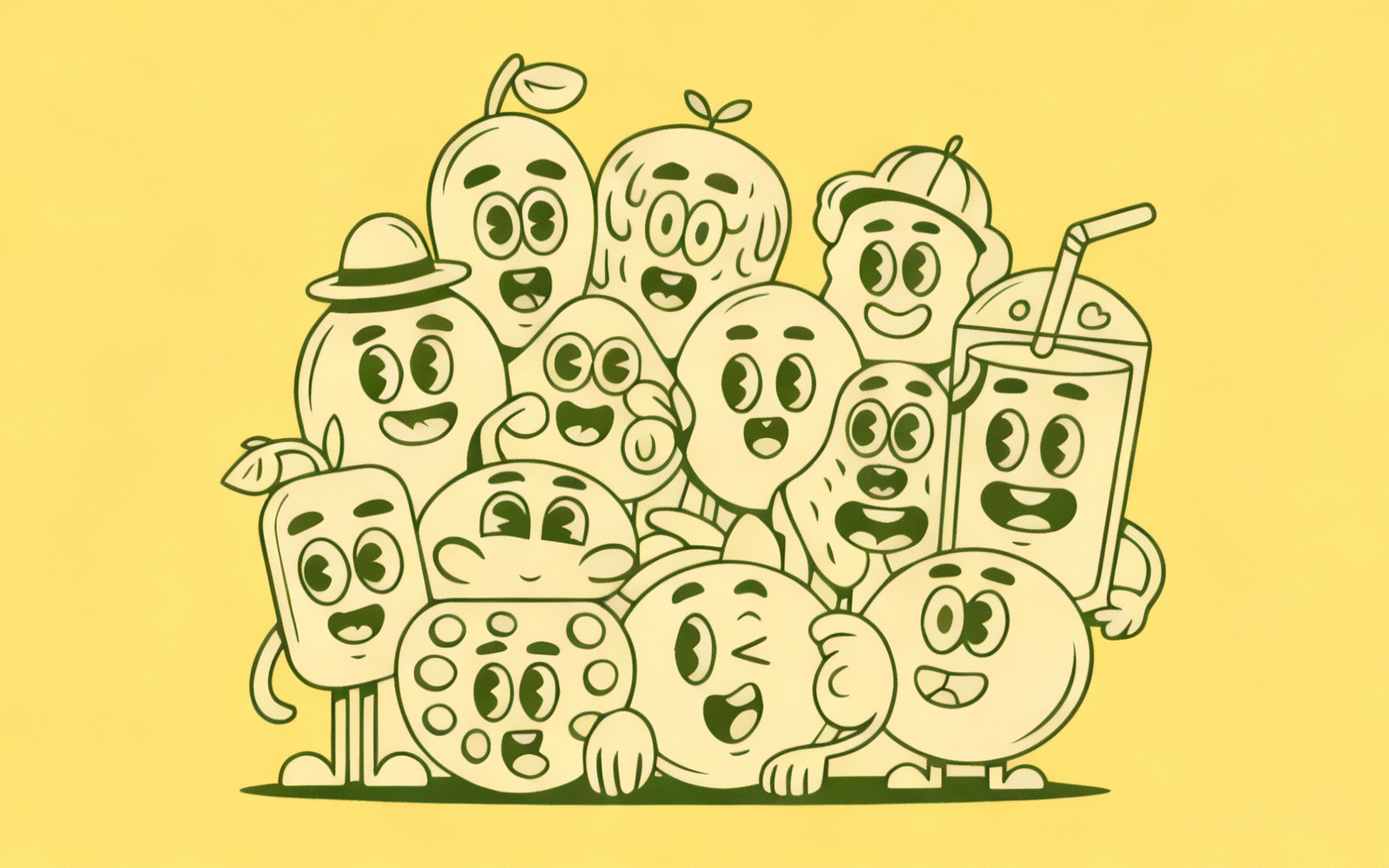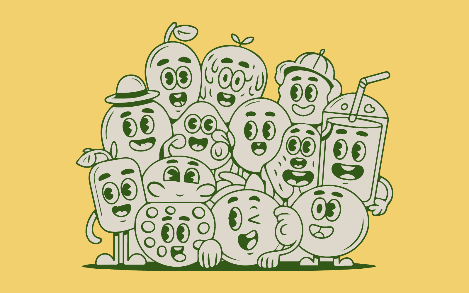 A clean vector illustration featuring a group of cute and funny fruit characters, including banana, strawberry, pineapple, orange, tomato, and blueberries. Perfect for kids projects, coloring pages, product packaging, mascots, t-shirts, and playful branding. Fully editable vector file.