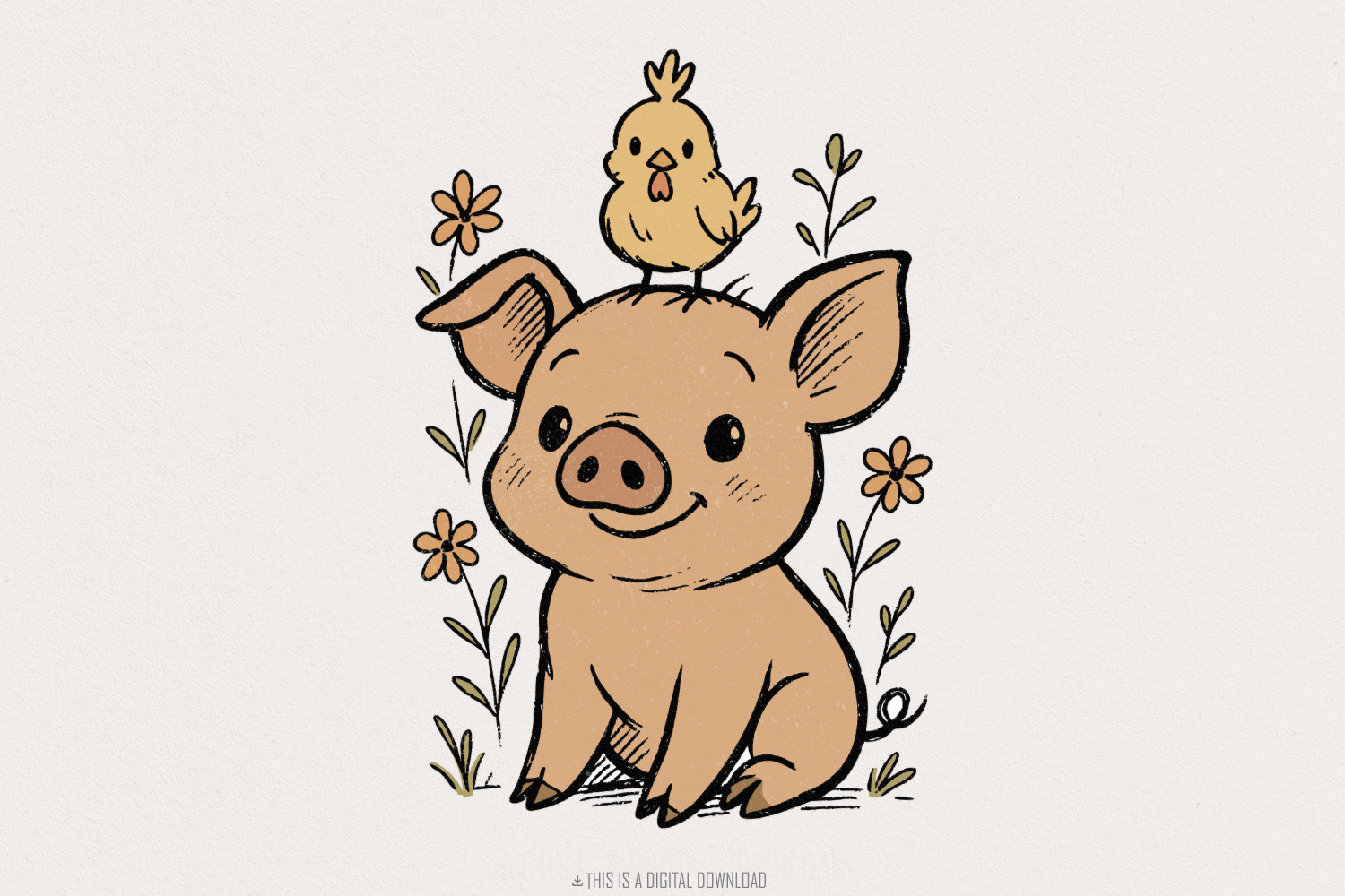 Cute Pig with Chick on Head PNG, Funny Farm Animal Sublimation, Vintage Piglet Art, Country Chick Illustration