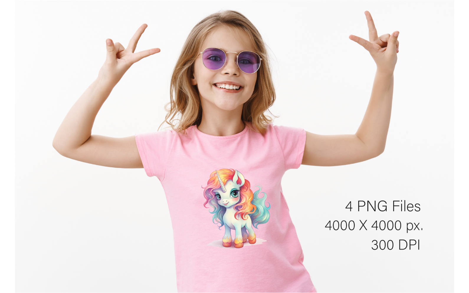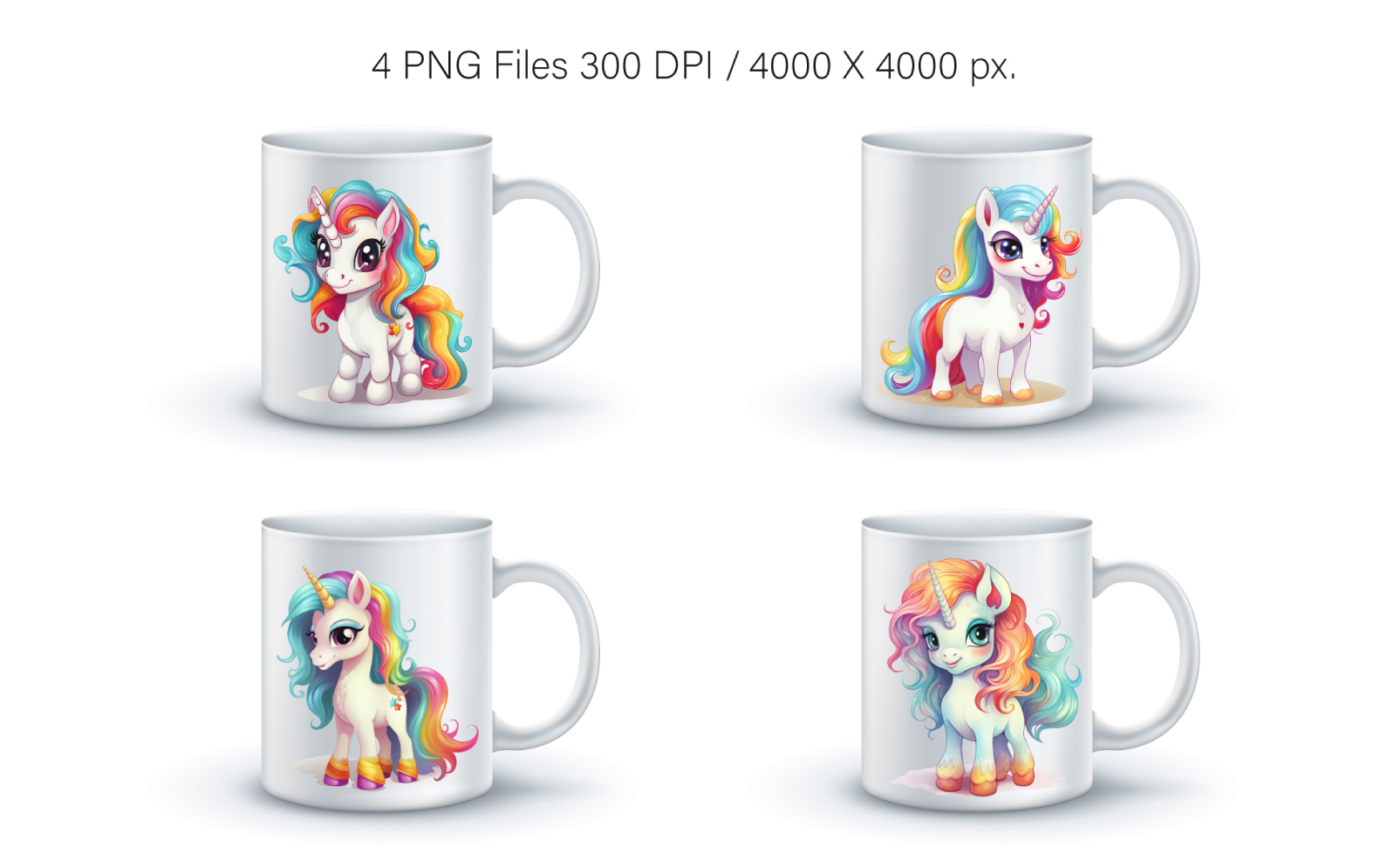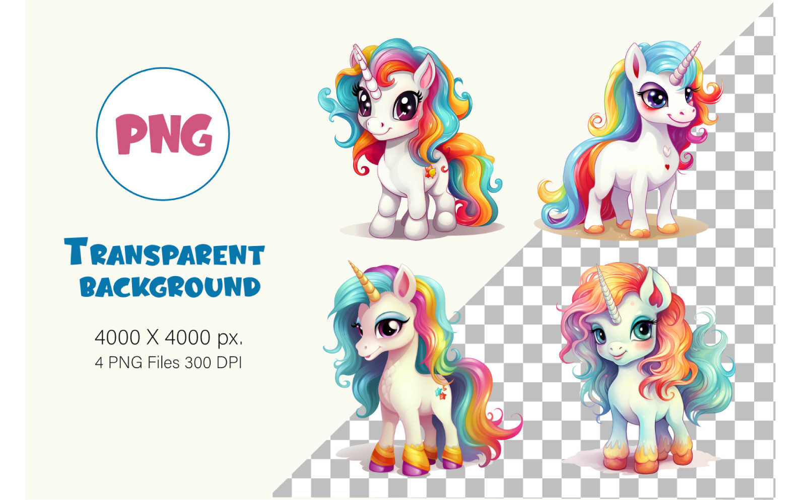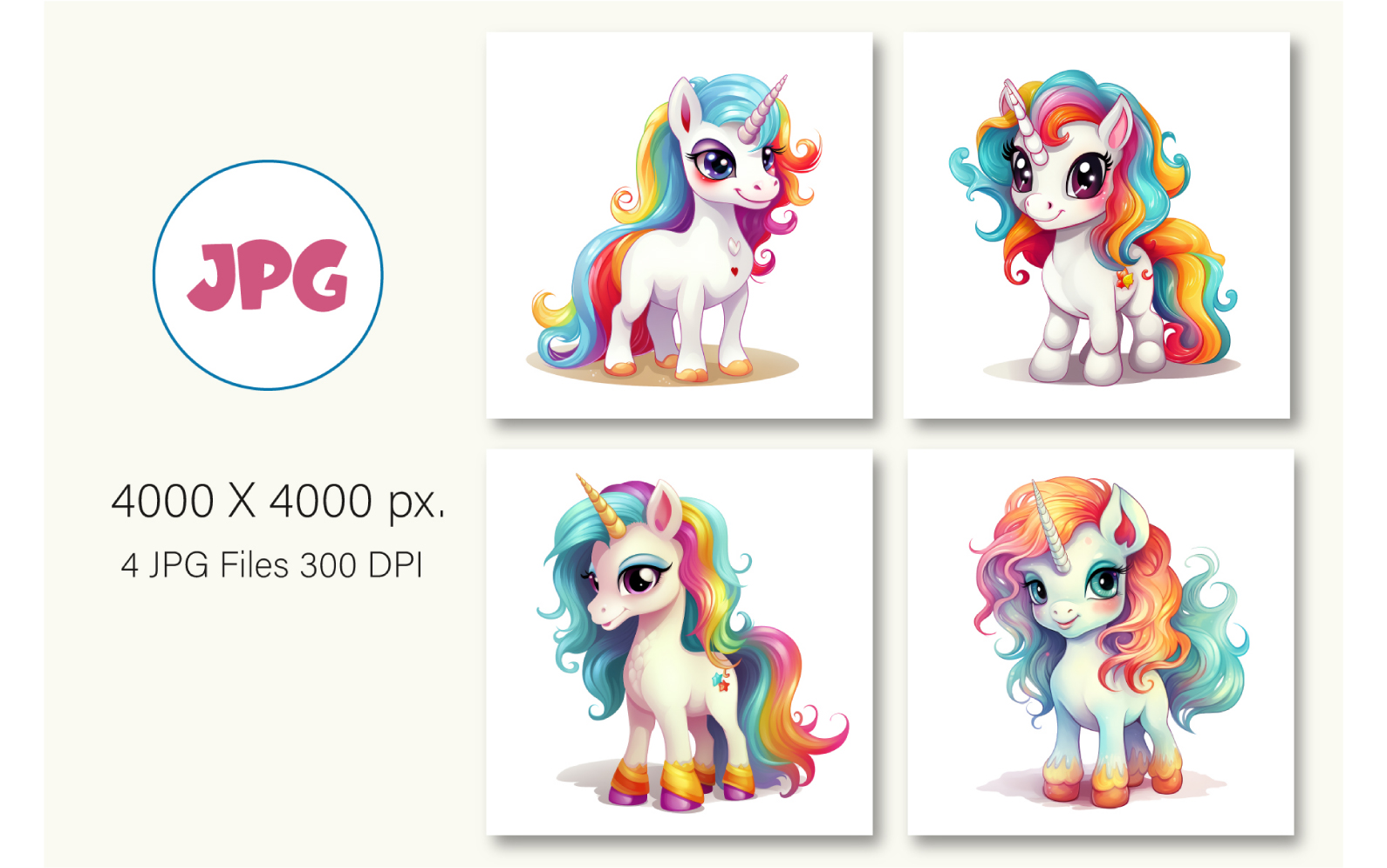 4 Сute rainbow unicorns Clipart is a great choice for creating cards, invitations, party supplies and decorations, logos, planners, wall decor, decorating your blog, literature illustration, or creating stickers.