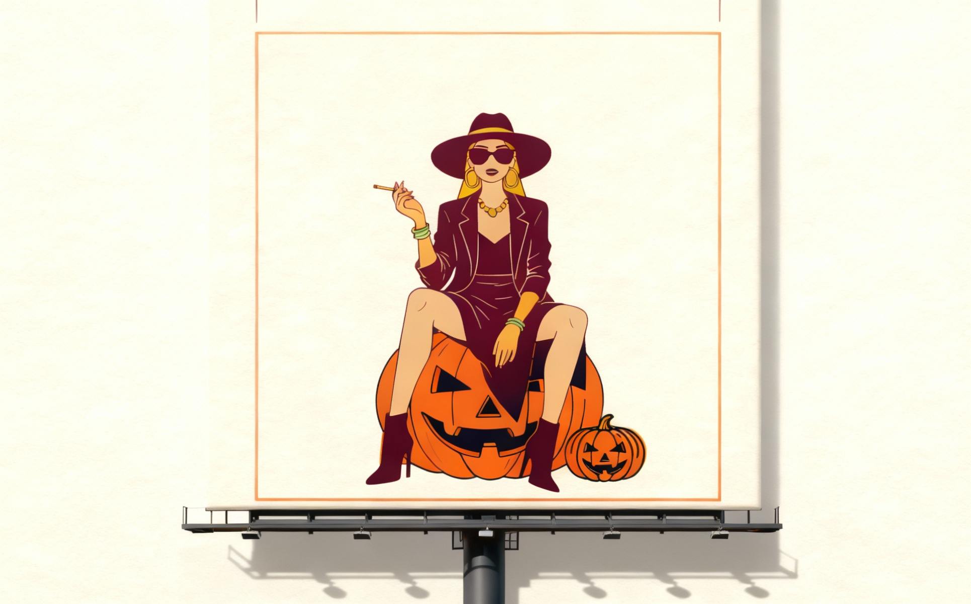 This premium Halloween illustration features two confident female characters with a fashionable and mysterious aesthetic, surrounded by spooky carved pumpkins and Halloween elements. Designed in a bold graphic style with strong shapes and dramatic contrast, this artwork brings modern elegance to the Halloween theme.