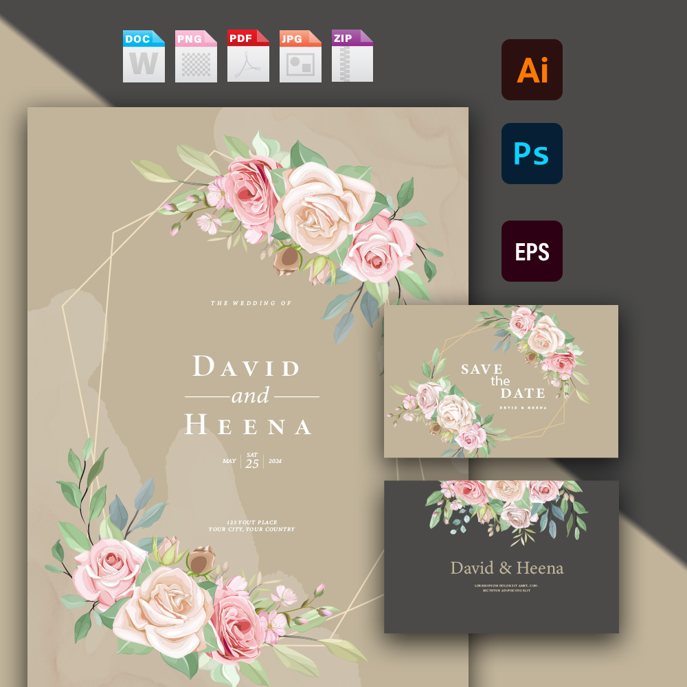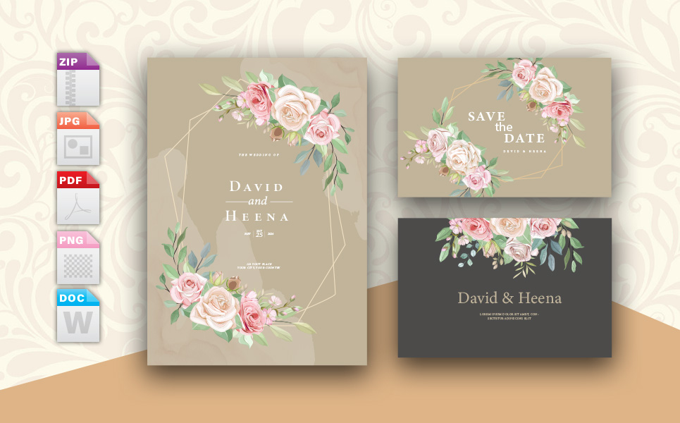 David & Heena - Elegant floral wedding invitation card set Illustration