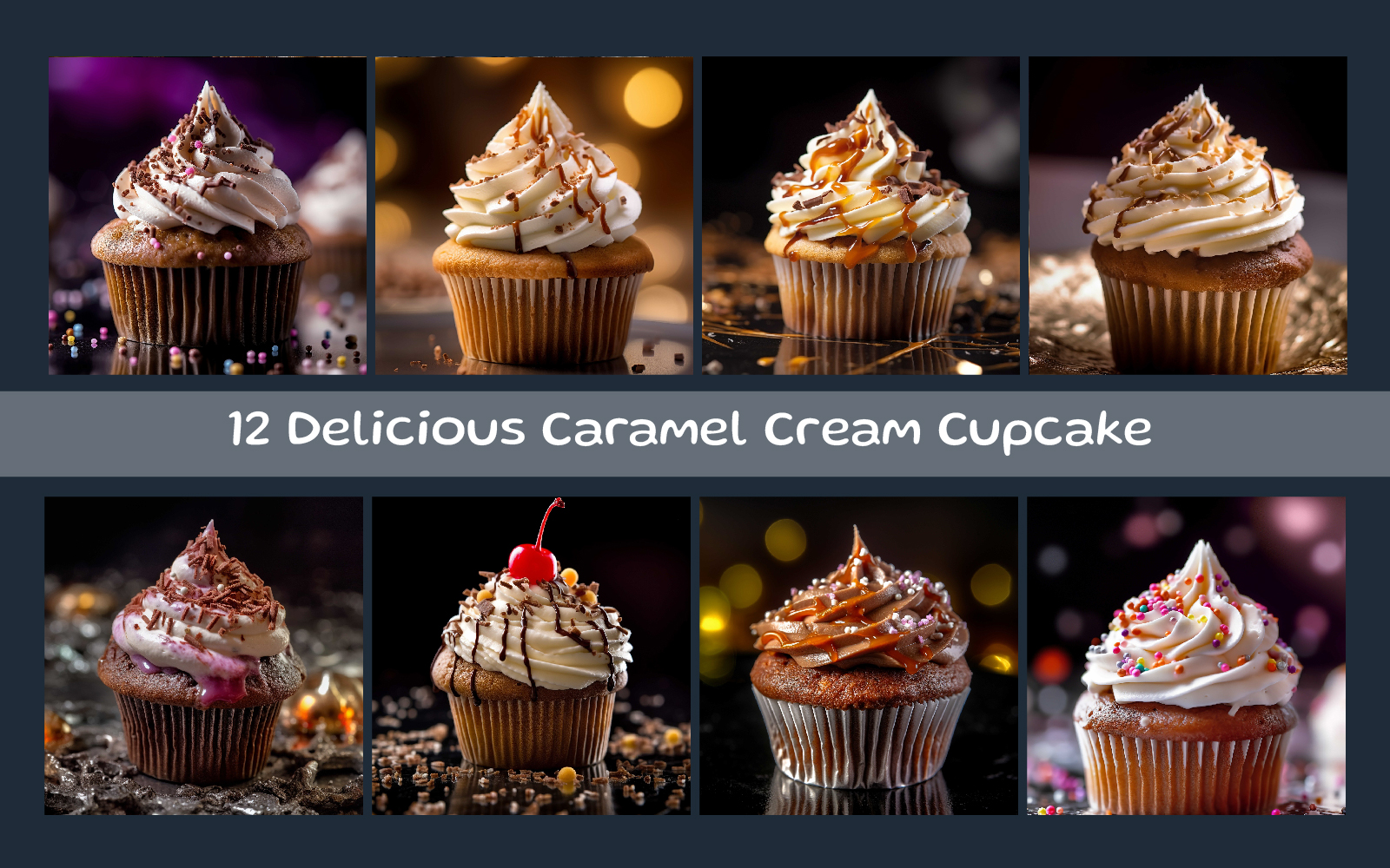 Delicious Caramel Cream Cupcake. Enjoy the art of baking with our pastry and sweets AI images. This delightful artwork captures the essence of this classic pastry, showcasing its golden crust and soft, fluffy texture. Perfect for bakery menus, recipe books, or culinary-themed designs, social media post, banner and etc. it adds a touch of artisanal charm to your creative projects.