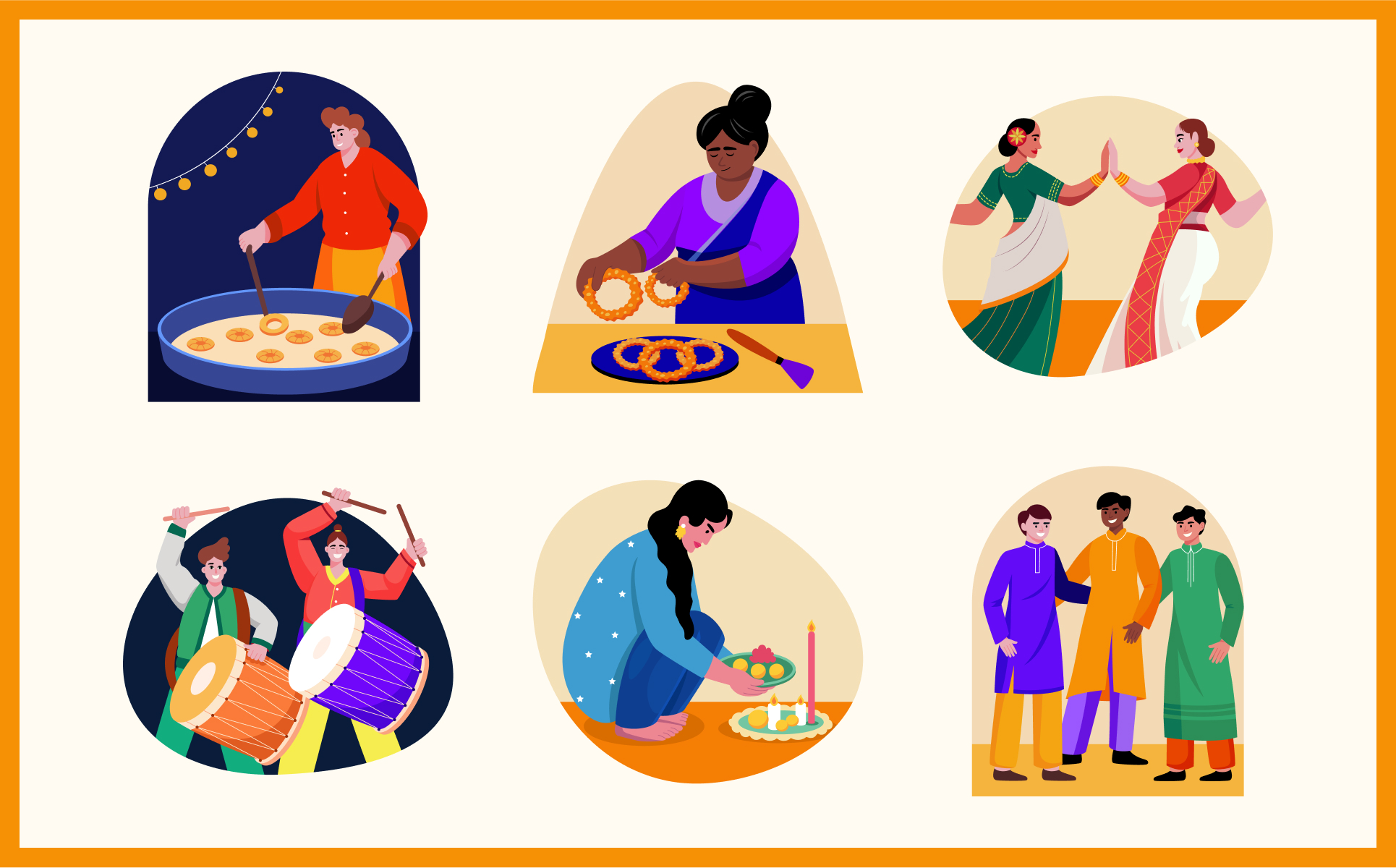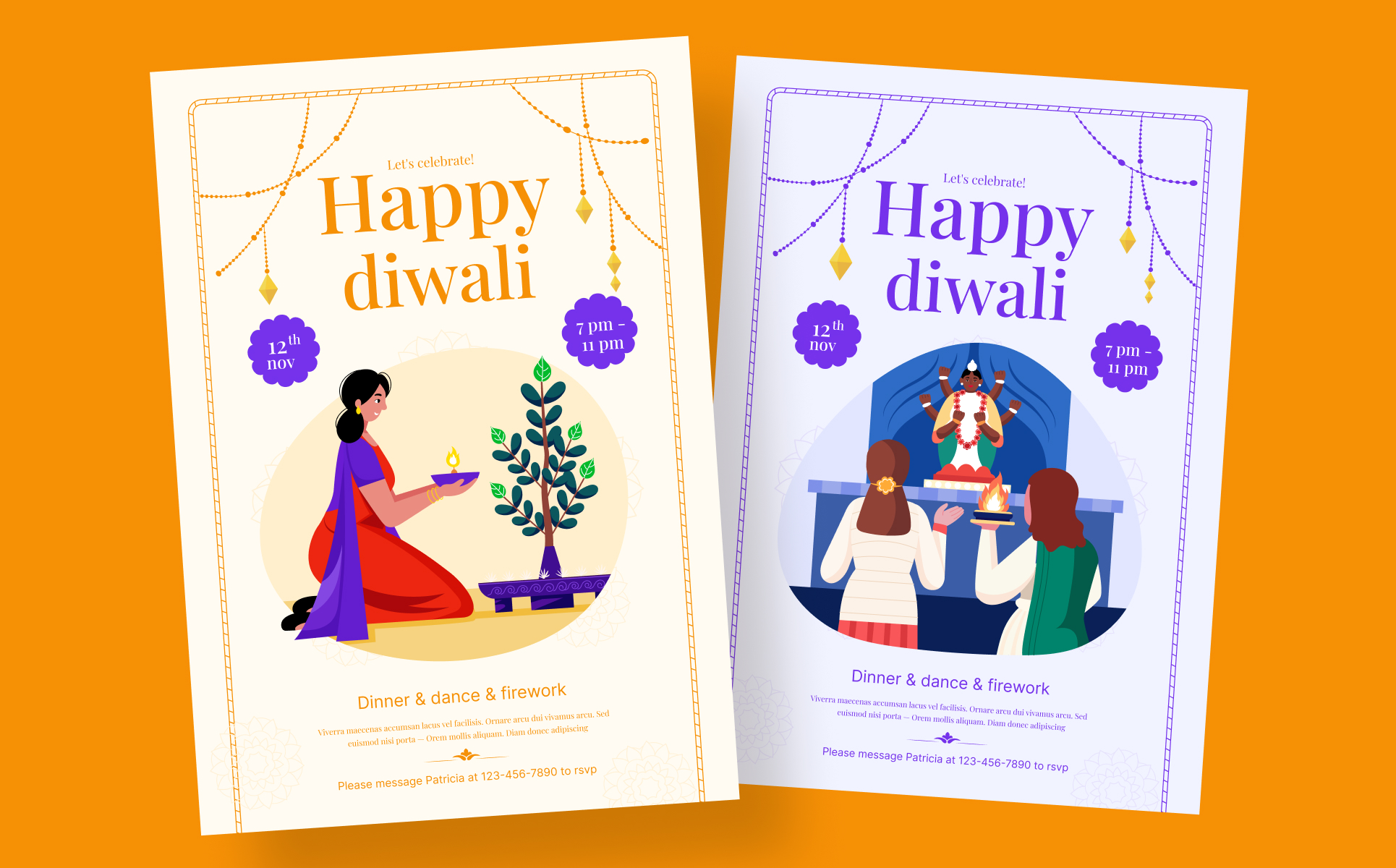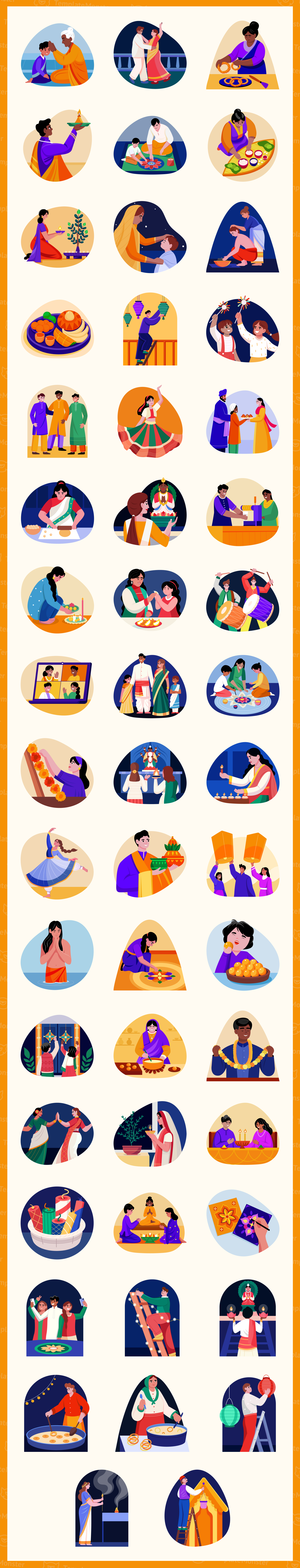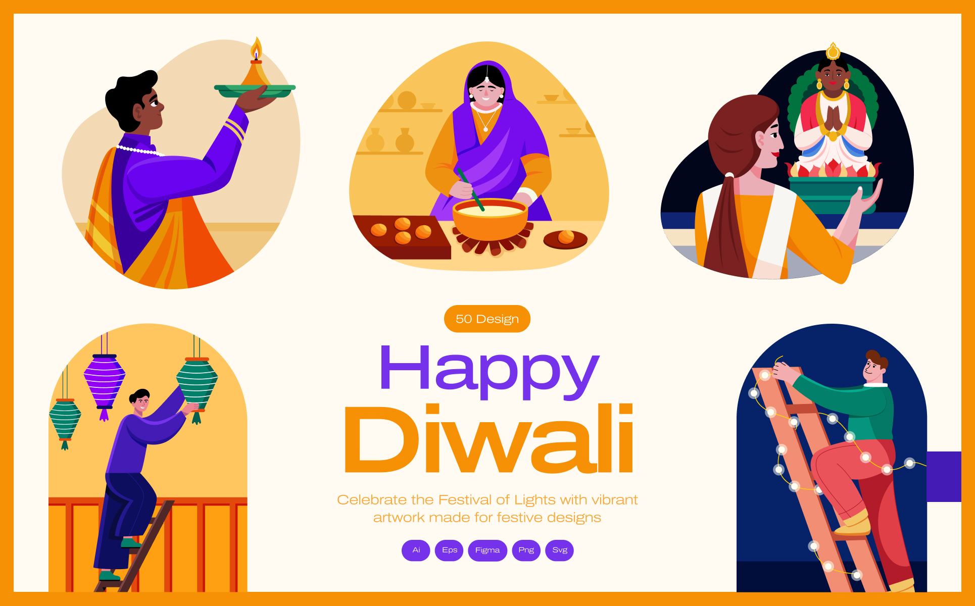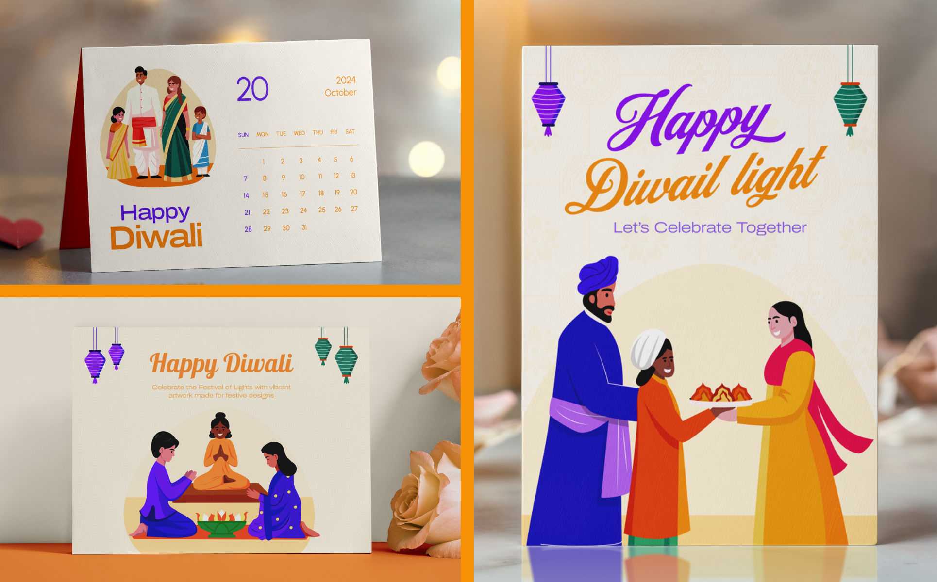 - Traditional Diwali elements: lamps, sweets, decor, and more