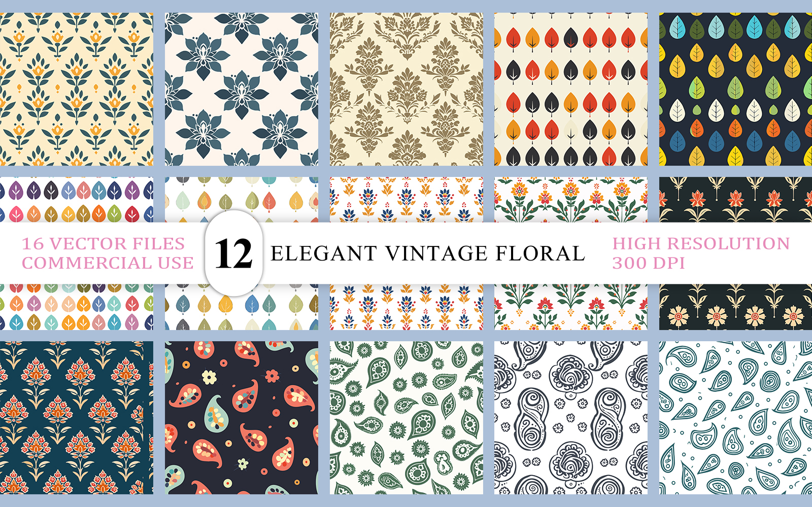 16 Elegant Vintage Floral Seamless Backgrounds Vector Bundle | Premium Quality | Commercial Use Ready
