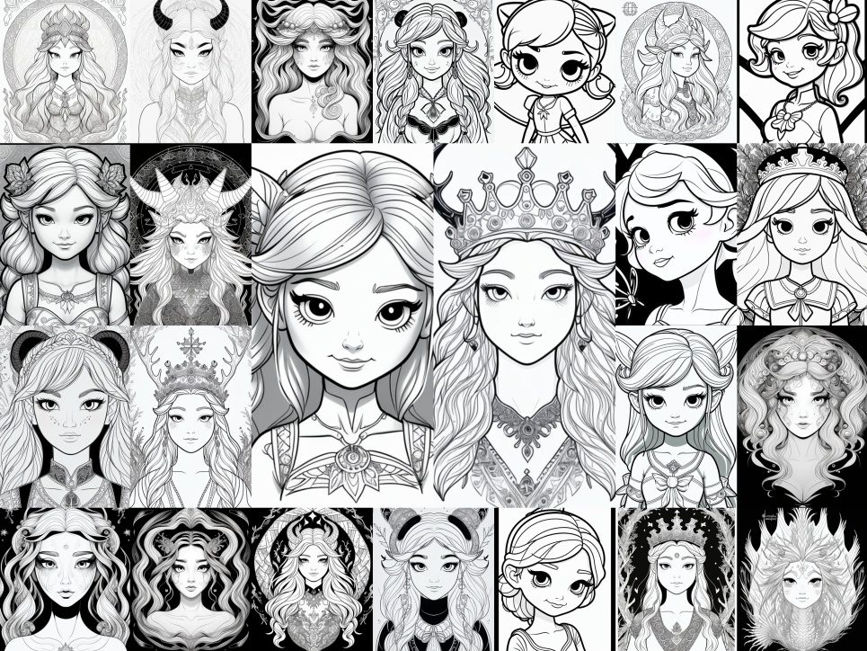 This extraordinary collection showcases 24 beautifully unique princess characters, each individually crafted using cutting-edge AI art technology! From regal queens with intricate crowns to charming fairy tale heroines, every single design brings its own personality and magical charm to life. This diverse ensemble celebrates different artistic styles - ranging from elegant detailed portraits to adorable anime-inspired characters - creating a comprehensive collection that captures the wonder and enchantment of royal fantasy worlds.