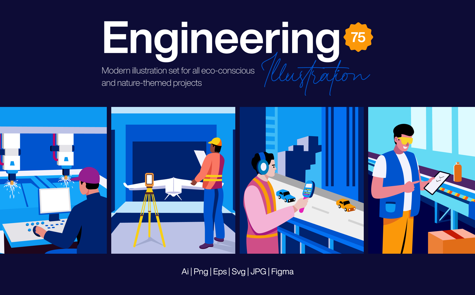 Dive into a world where creativity meets precision with our engineering illustration art set. Crafted to capture the essence of engineering brilliance, this collection brings technical concepts to life through detailed blueprints, and iconic development scenes. Whether you're illustrating a big idea, designing for education, or adding a touch of industry to your visuals, this set fuels your imagination with a clean, professional aesthetic. Let your projects speak the language of innovation and structure, all in one inspiring pack.