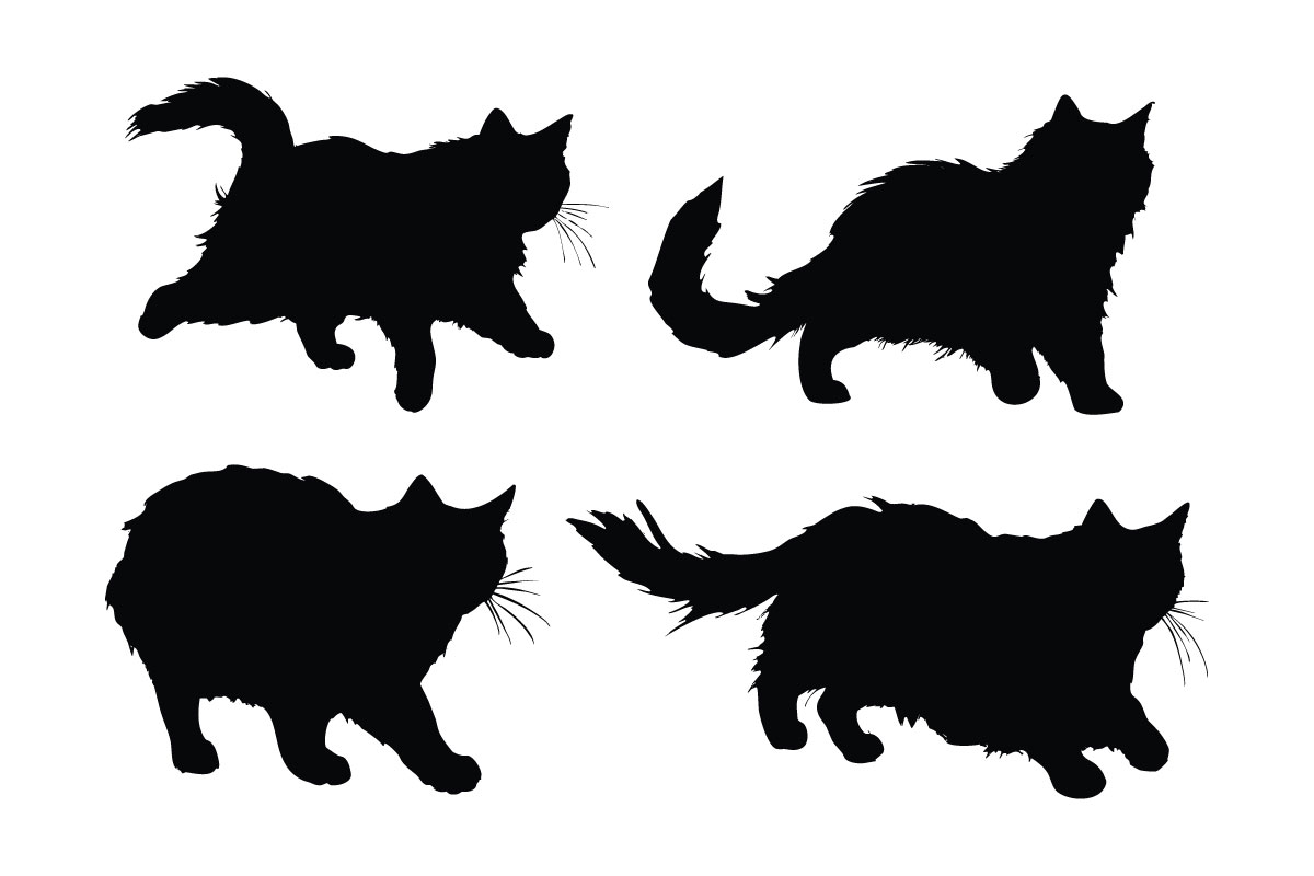 Feline playing silhouette design set. Cute home cat vector design on a white background. Cute cat walking silhouette bundle design. Feline standing silhouette set vector. Cat standing in different positions silhouette collection.