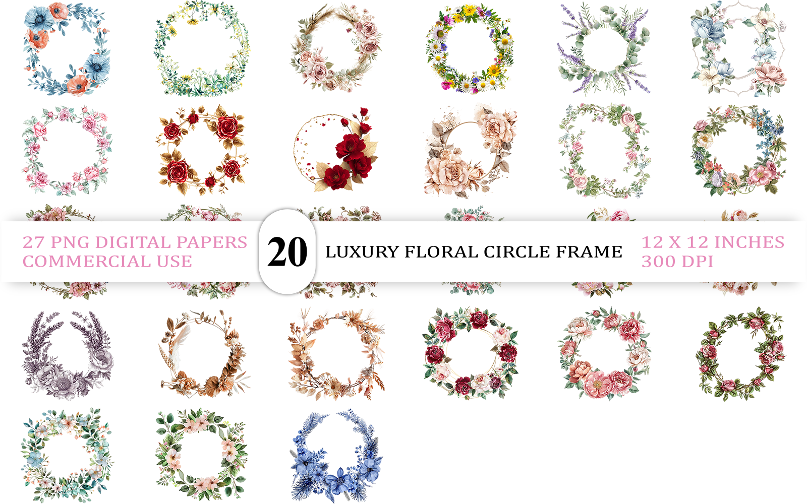 Elevate your design projects with this collection of soft romantic floral PNG frames. Featuring gentle pastel tones, peonies, roses, and wildflowers arranged in circular compositions, Each design is high-resolution with transparent backgrounds, allowing seamless integration into any creative work.
