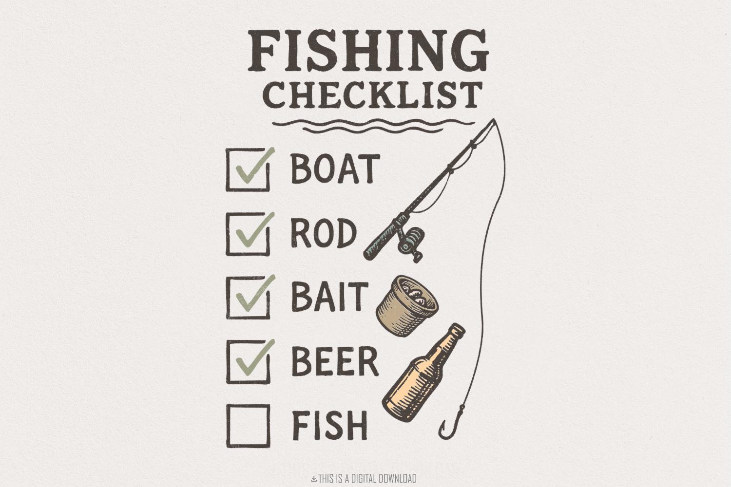 Fishing Checklist PNG, Boat Rod Bait Beer Fish, Funny Fisherman Digital Download, Printable Shirt Illustration