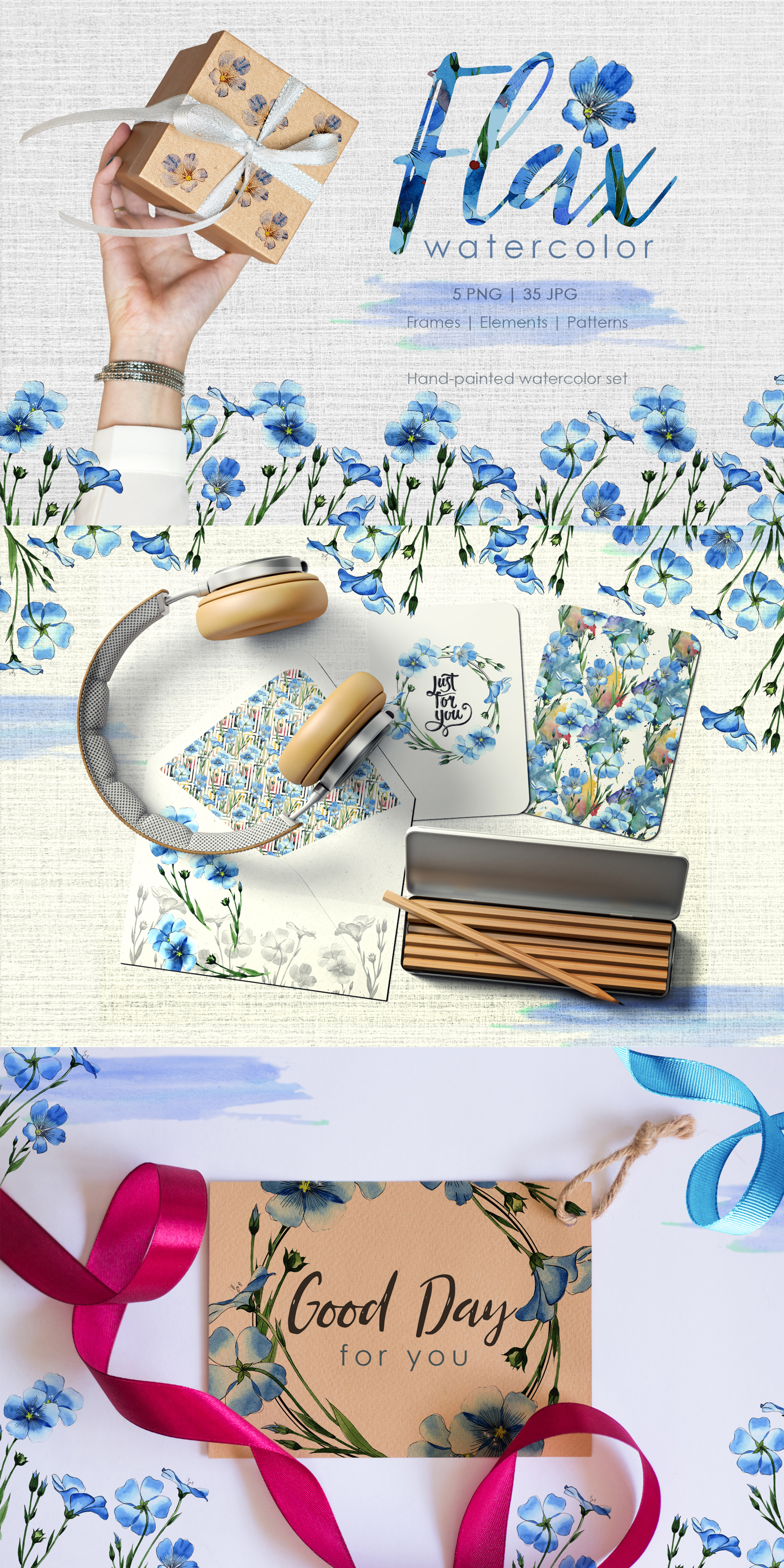 Flax blue Watercolor png clipart of 40 files. Ideal material for DIY, wedding invitations, greeting cards, quotes, blogs, posters and more.