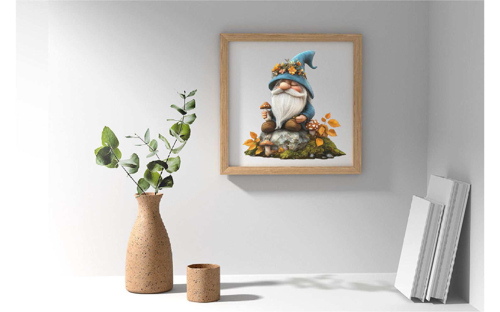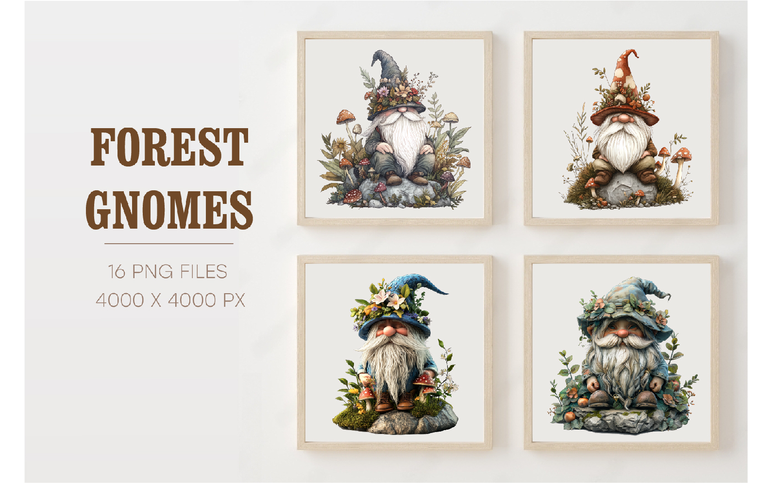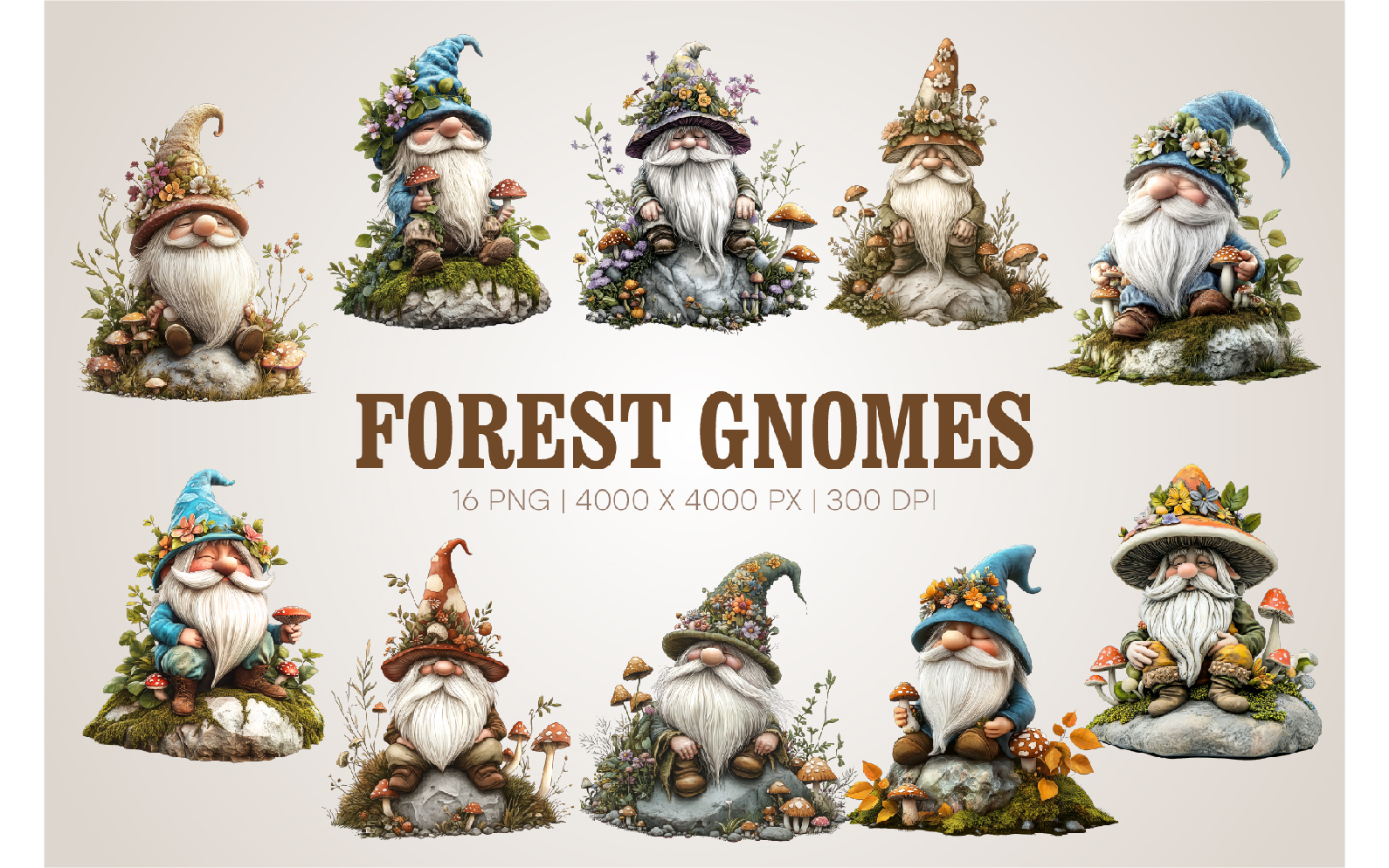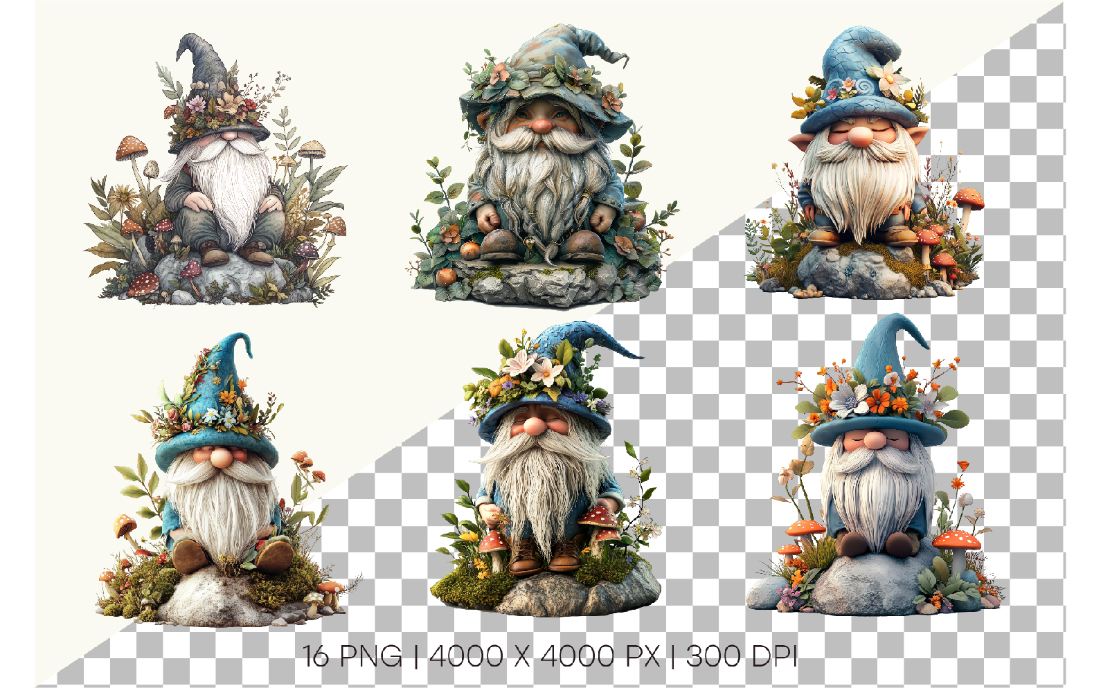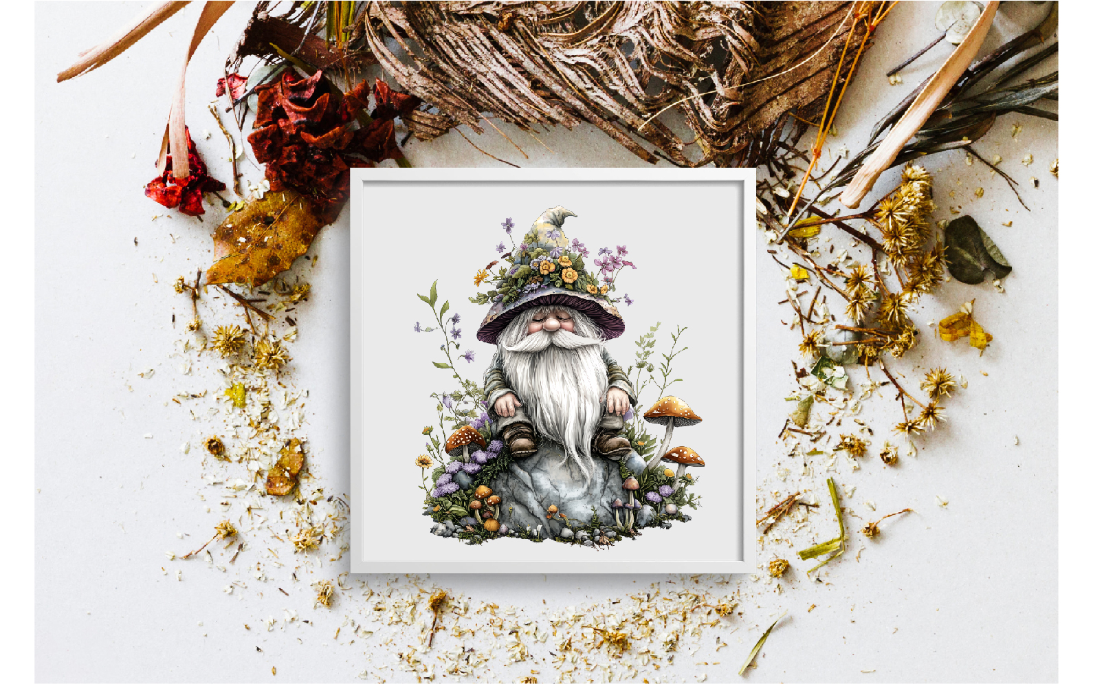 Cute illustration of a cartoon forest gnome sitting on the grass with flowers.