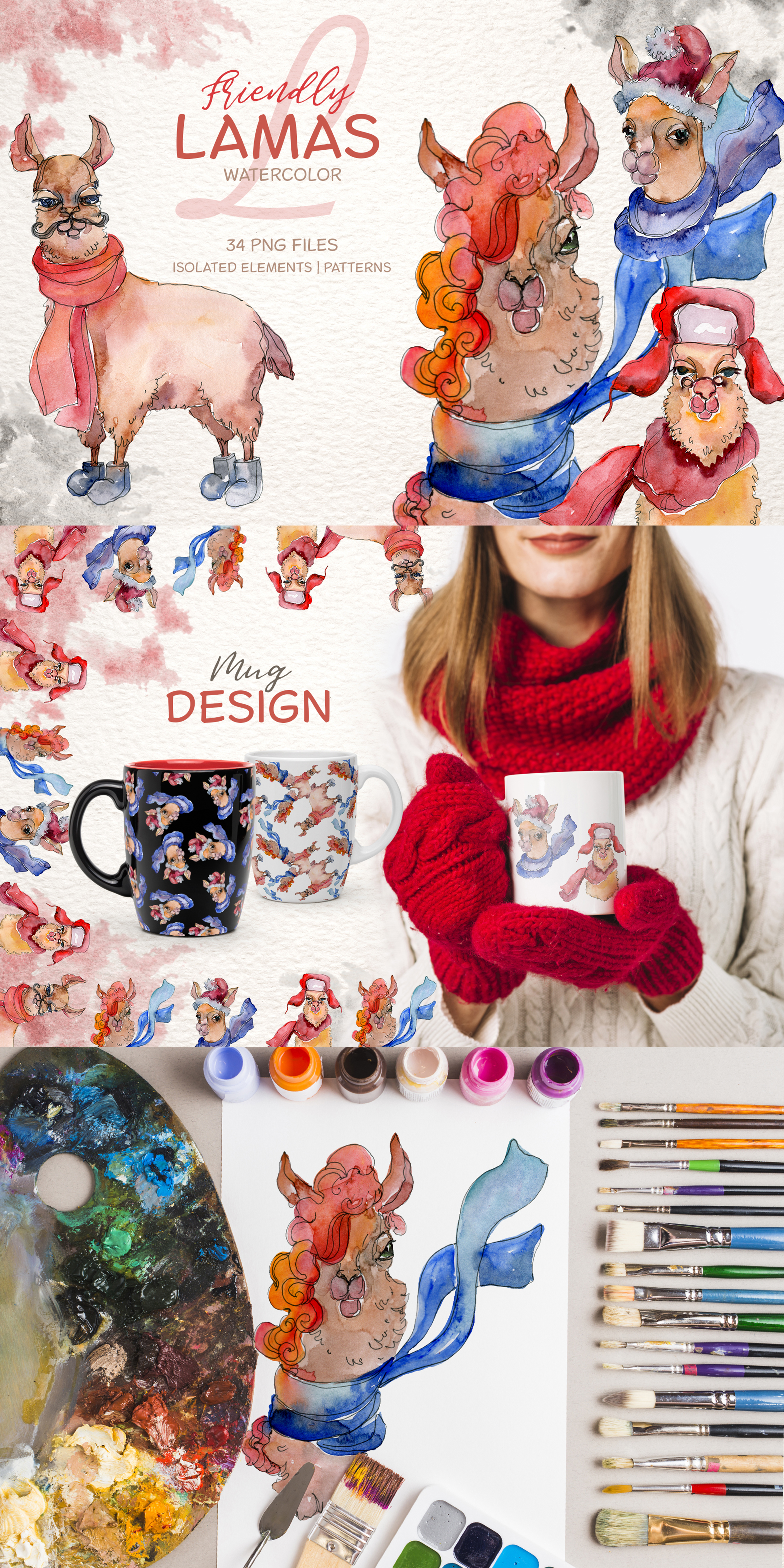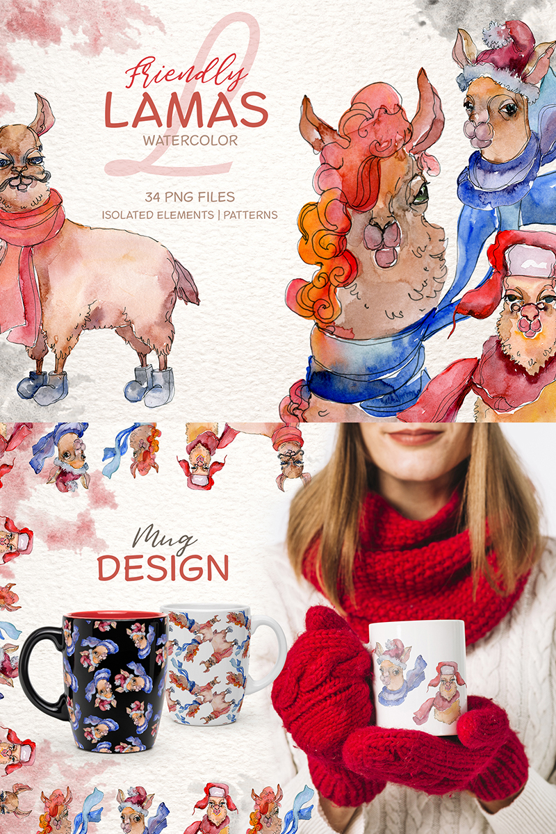 Friendly Lamas Watercolor png clipart of 34 files. Ideal material for DIY, wedding invitations, greeting cards, quotes, blogs, posters and more.