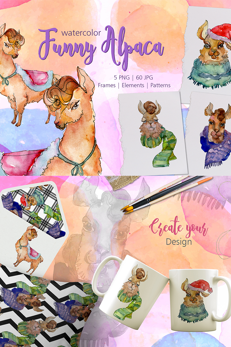 Funny Alpaca Watercolor png clipart of 65 files. Ideal material for DIY, wedding invitations, greeting cards, quotes, blogs, posters and more.