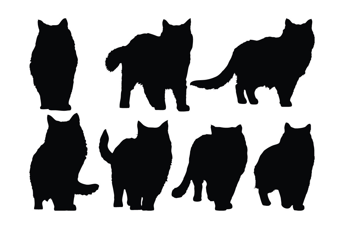Furry feline silhouette bundle vector. Feline standing silhouette set vector. Cute cat walking silhouette bundle design. Cute home cat vector design on a white background. Domestic cat in different positions silhouette collection.