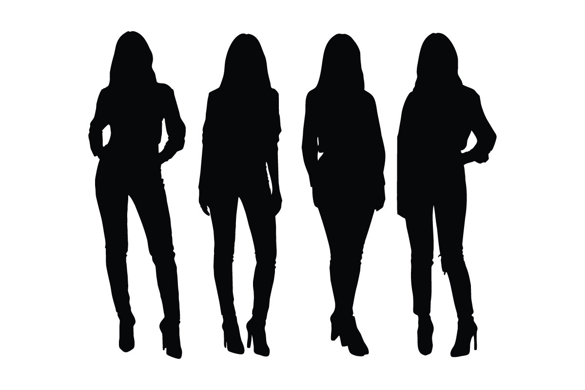Girl model wearing fashion cloths vector. Female models and actors standing in different position silhouette set vectors. Girl models with anonymous faces. Actors wearing uniforms silhouette collection. Fashion designer girl silhouette.