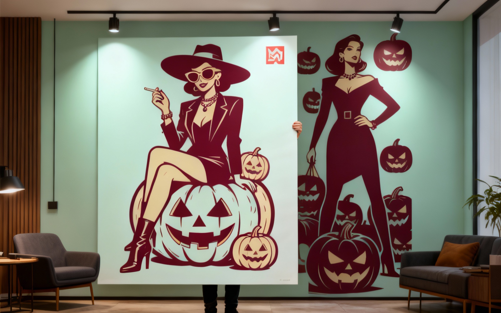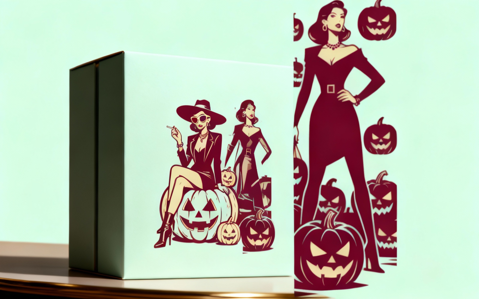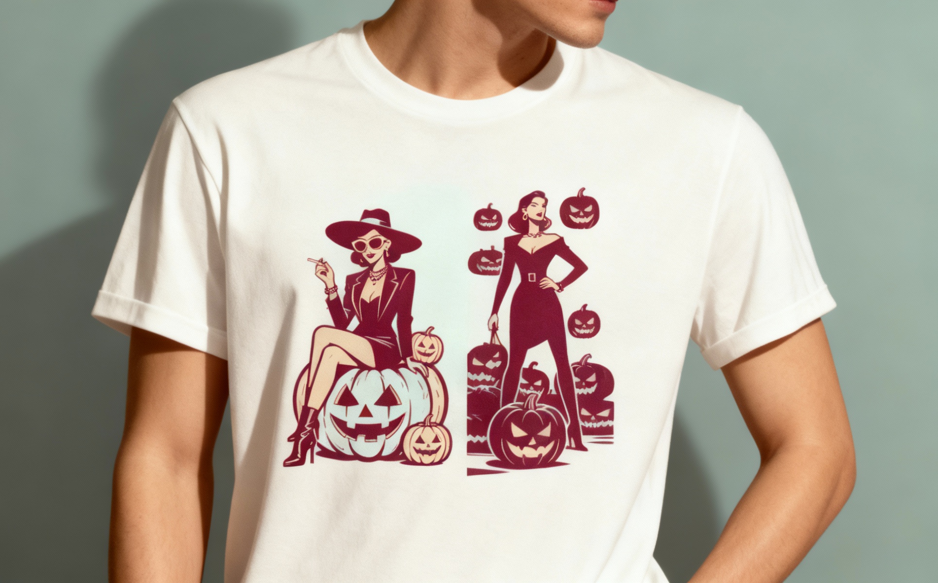 This premium Halloween illustration features two confident female characters with a fashionable and mysterious aesthetic, surrounded by spooky carved pumpkins and Halloween elements. Designed in a bold graphic style with strong shapes and dramatic contrast, this artwork brings modern elegance to the Halloween theme.