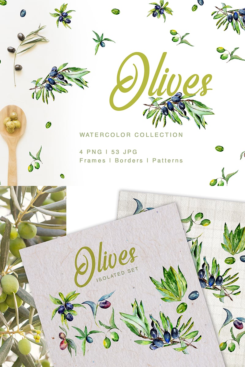 Green olives watercolor set of 57 files. Ideal material for DIY, wedding invitations, greeting cards, quotes, blogs, posters and more.