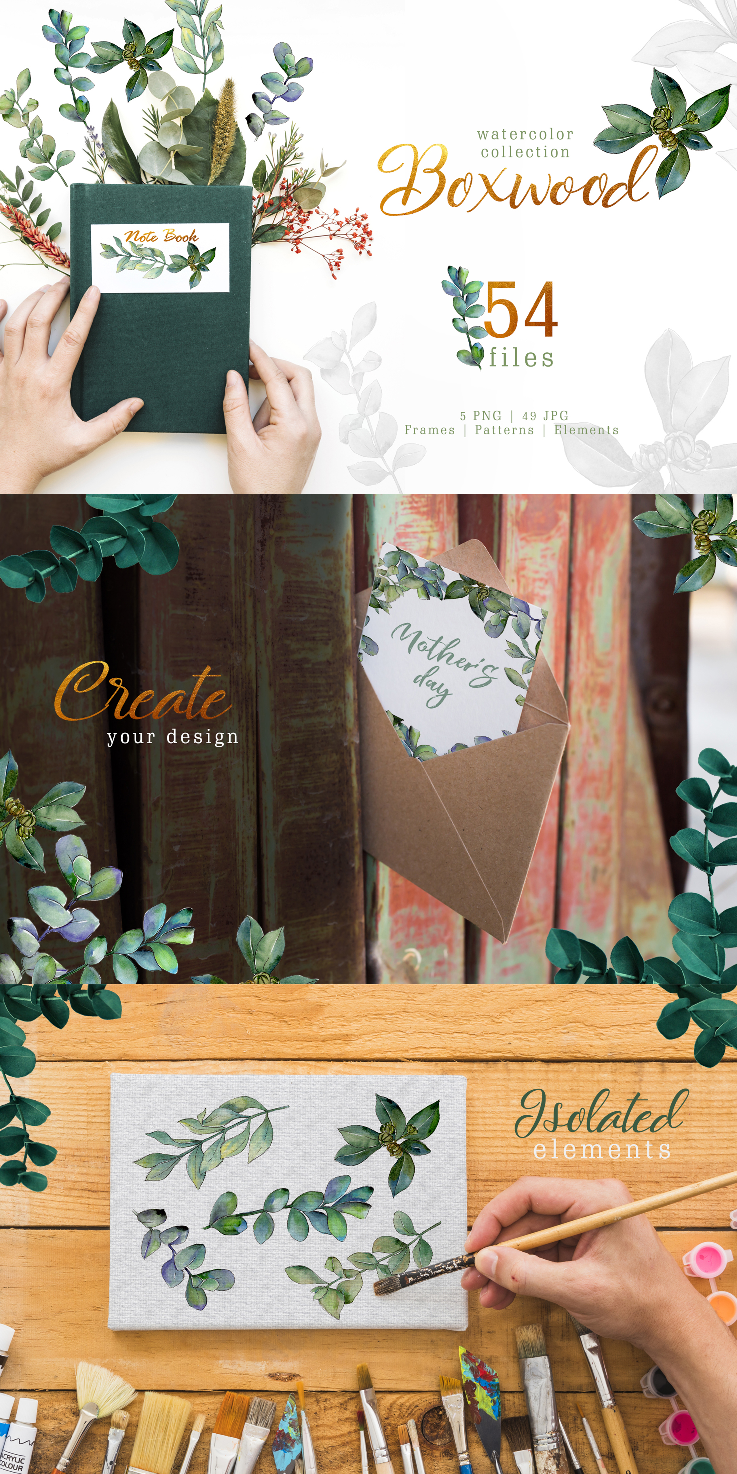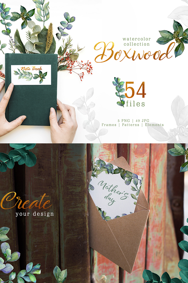 Green watercolor boxwood PNG clipart of 54 files. Ideal material for DIY, wedding invitations, greeting cards, quotes, blogs, posters and more.