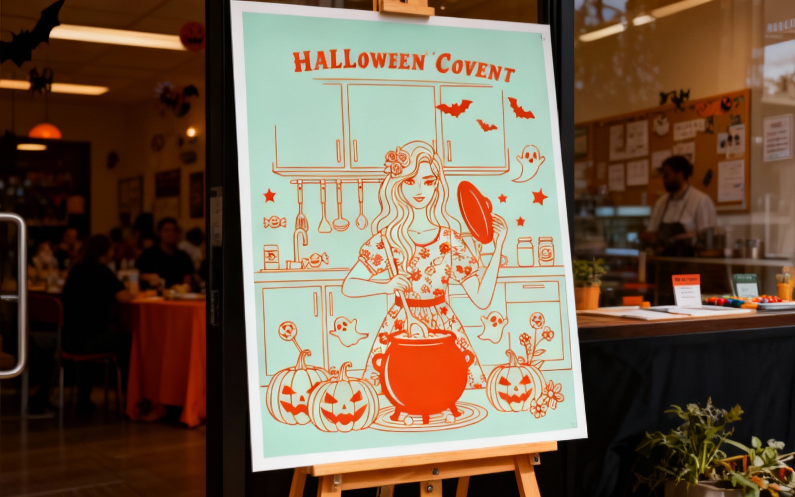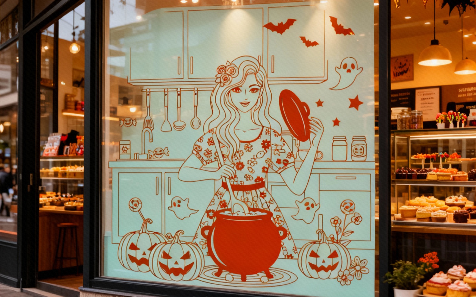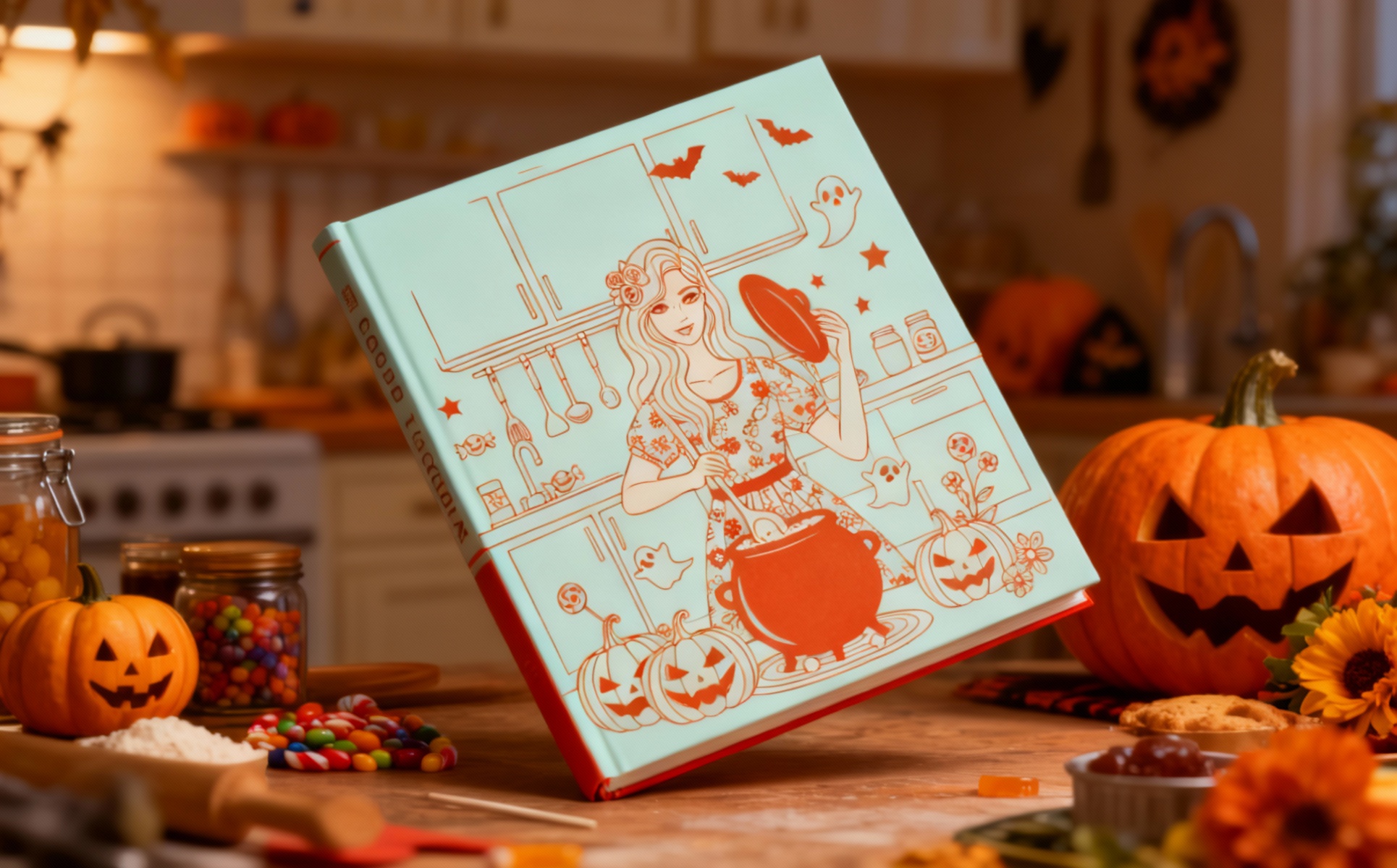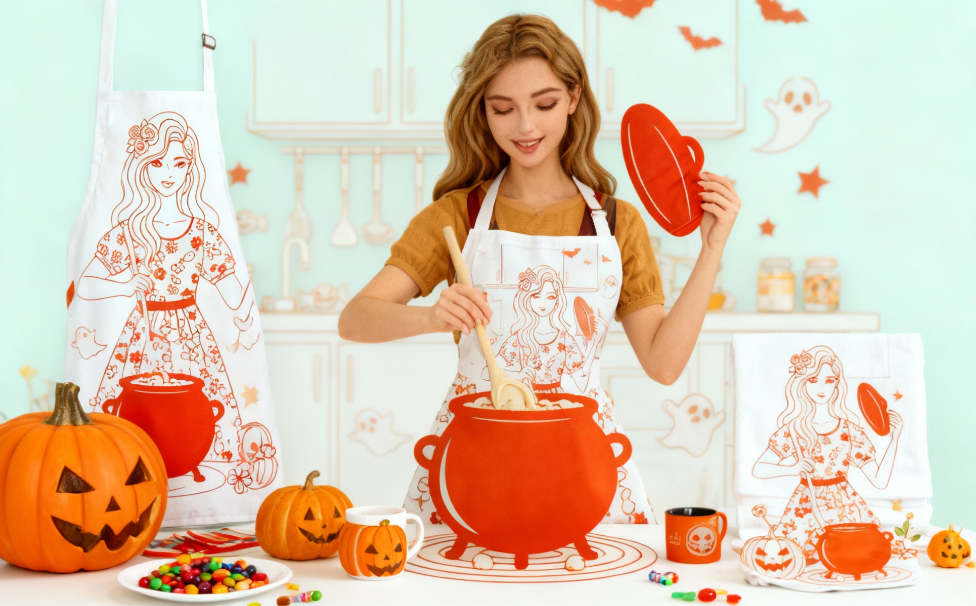 Unique Halloween cooking girl vector illustration designed in a clean modern spooky look. A stylish woman prepares magical Halloween treats in a decorated kitchen surrounded by pumpkins, bats, ghosts, and star shapes. Perfect for seasonal merchandise, posters, stickers, t-shirts, branding, and digital products. Fully scalable vector artwork with clear, sharp lines and smooth shapes suitable for professional print and web.