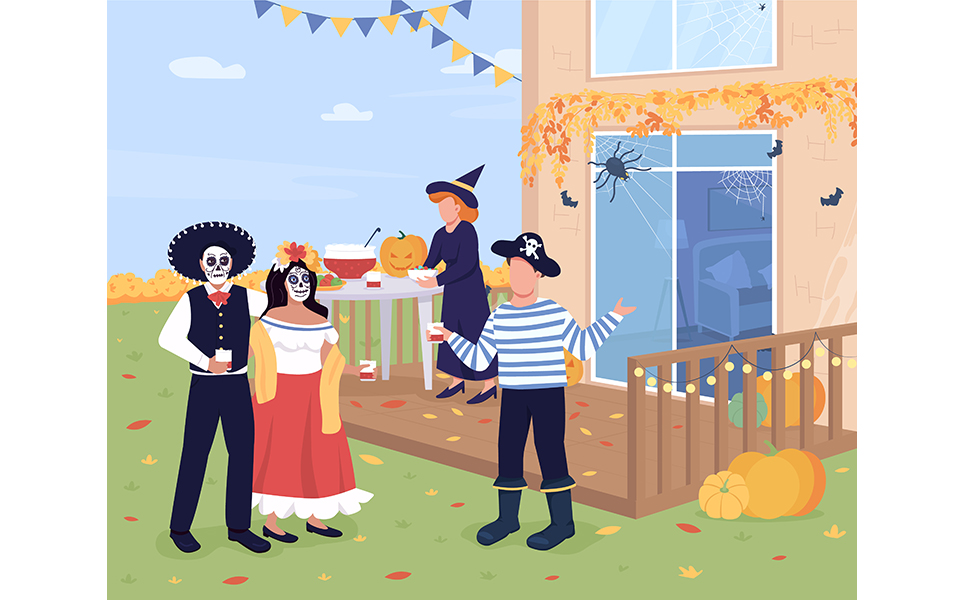 Halloween party in backyard flat color vector illustration. People eating treats and talking at seasonal event. Friends in costumes 2D cartoon characters with home yard on background .