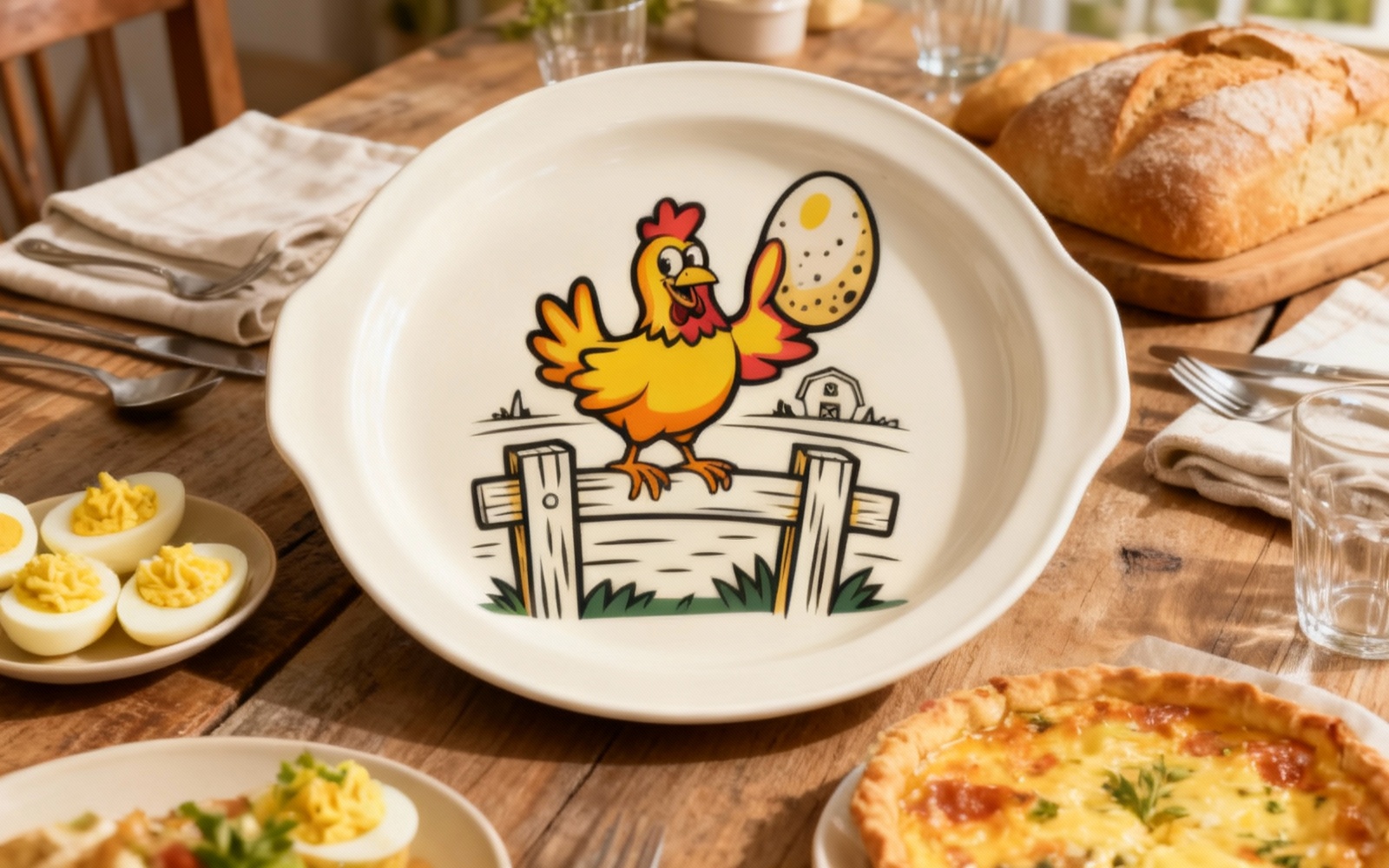 Happy Cartoon Chicken with Egg on Farm Fence - Vector Illustration