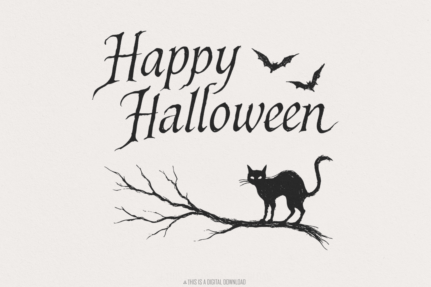 Happy Halloween Black Cat PNG, Spooky Bat Halloween PNG Digital Download, Halloween Cat Clipart, Vintage Branch Halloween Shirt PNG Art