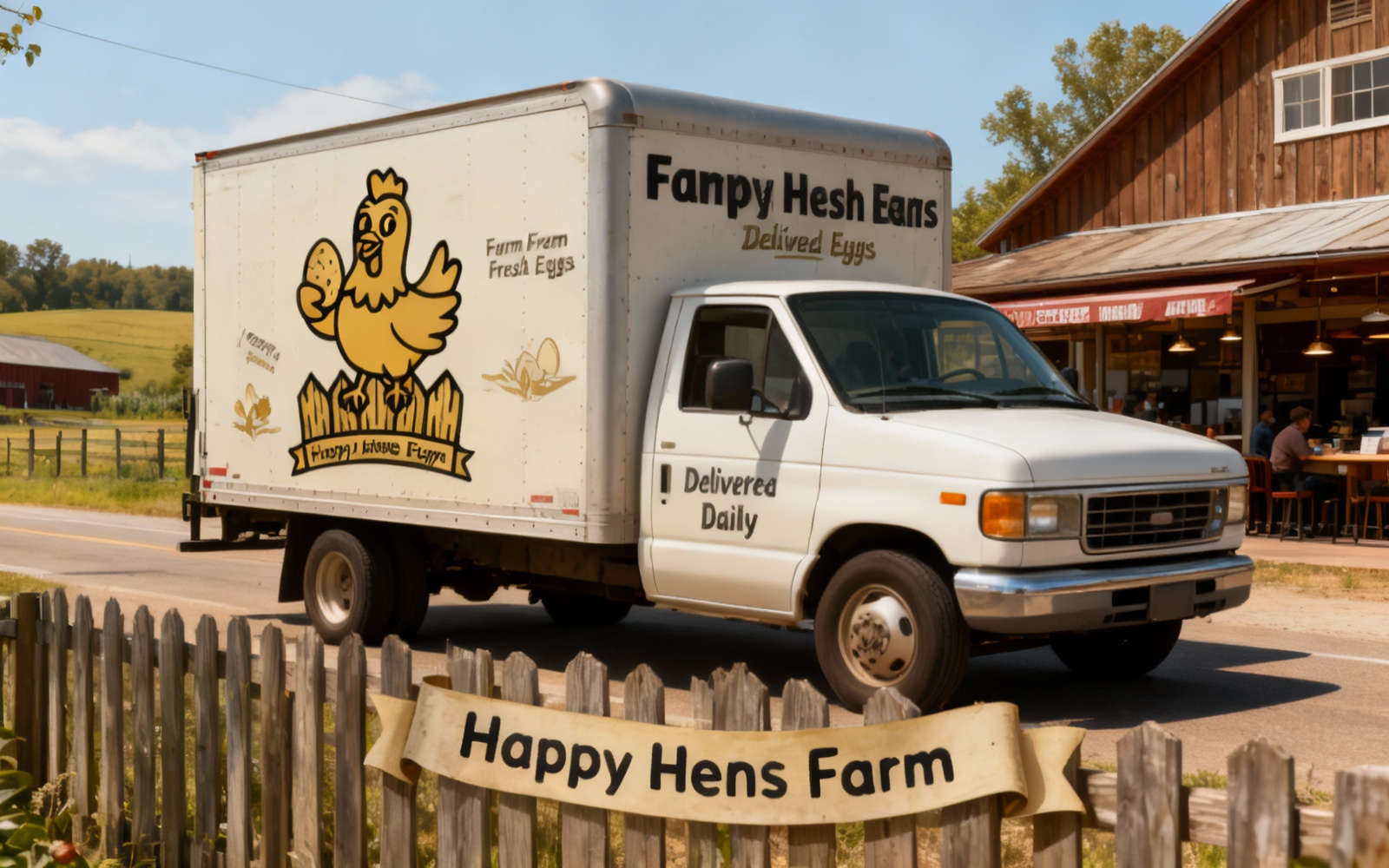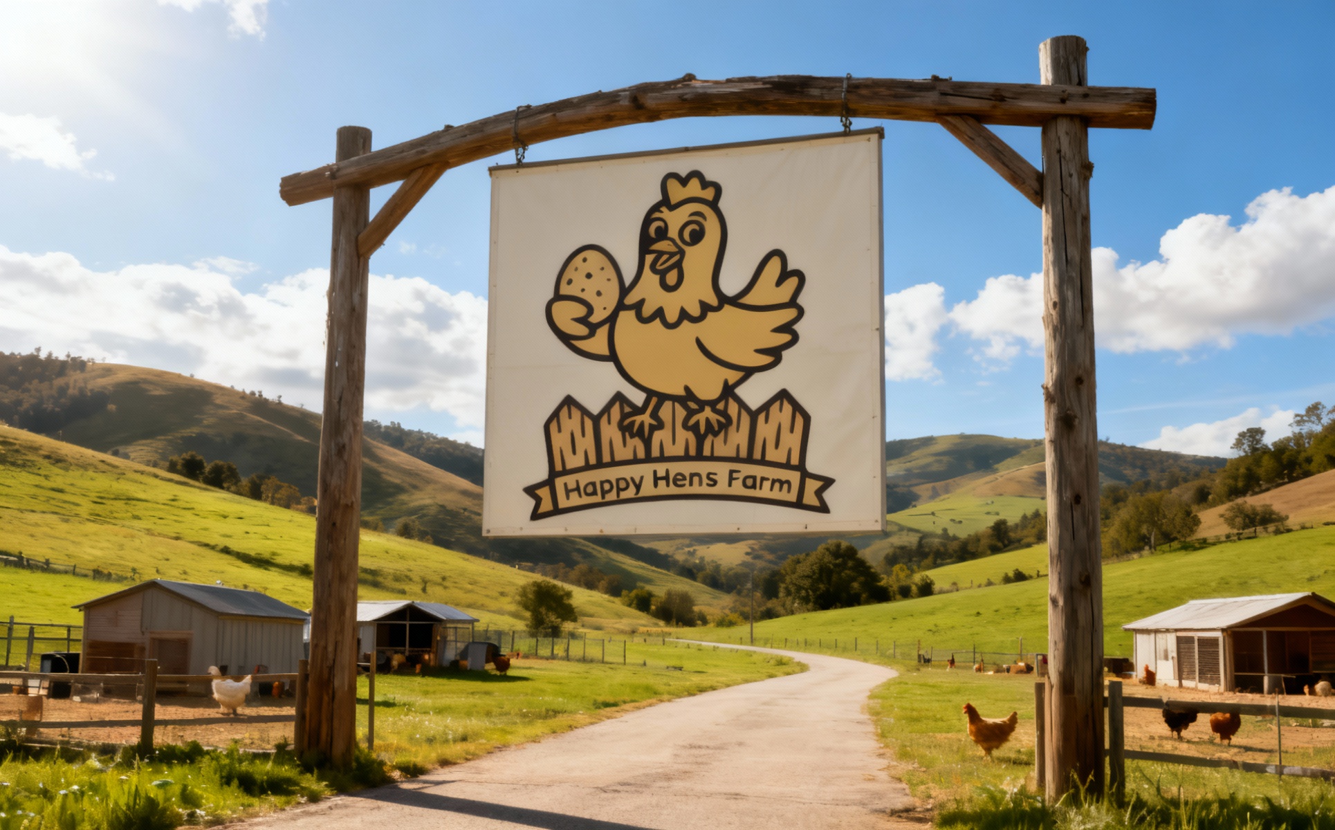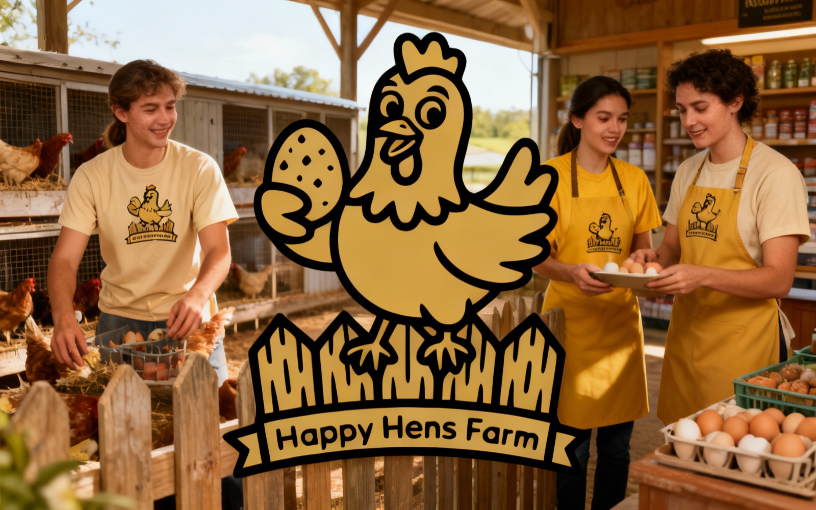 Happy Hens Farm Logo - Cartoon Chicken with Egg on Fence Vector Illustration