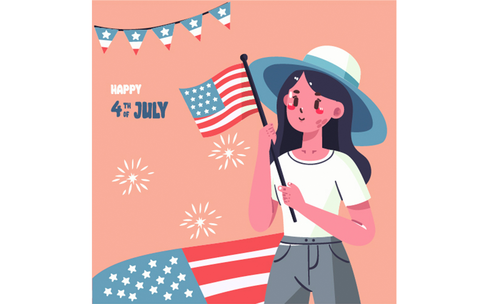 **Celebrate the 4th of July in style with this vibrant vector illustration featuring a happy girl proudly holding the American flag. Perfect for patriotic occasions, this illustration captures the joy and spirit of the holiday. The detailed artwork showcases the girl's cheerful expression and the flag's iconic stars and stripes, making it a versatile and eye-catching addition to any design project. Whether you're creating invitations, banners, or social media graphics, this illustration will help you convey a sense of patriotism and celebration**
