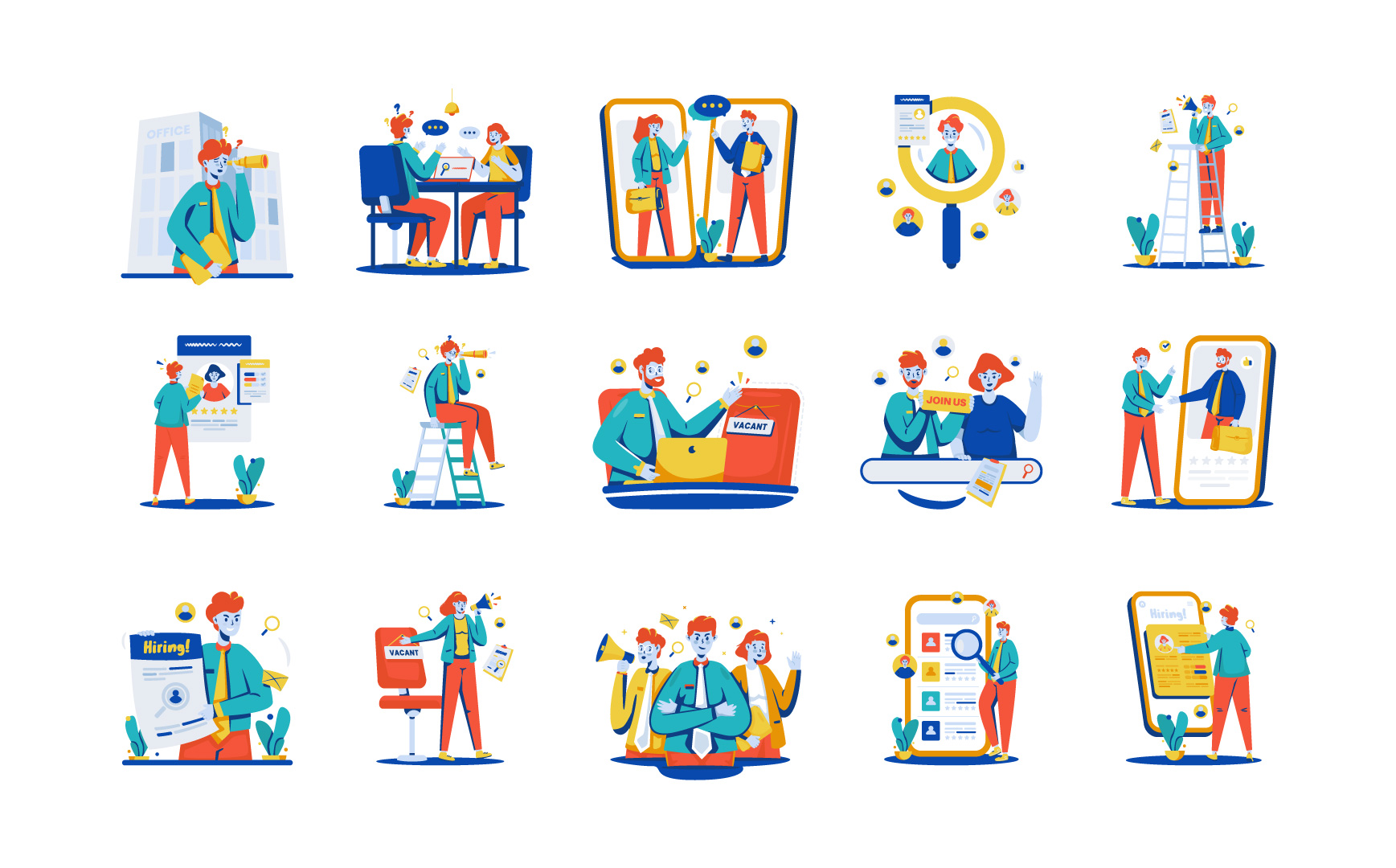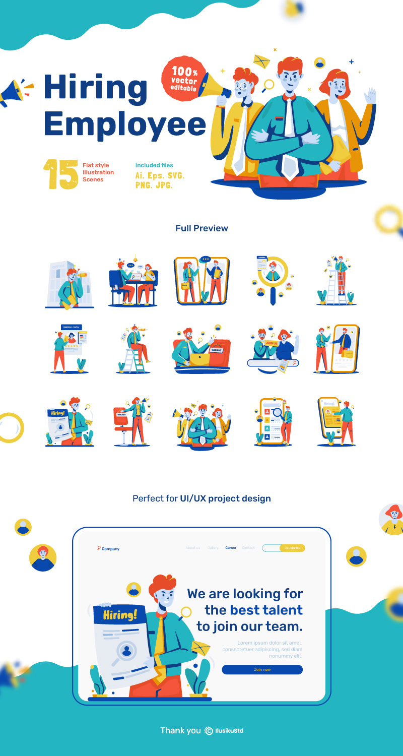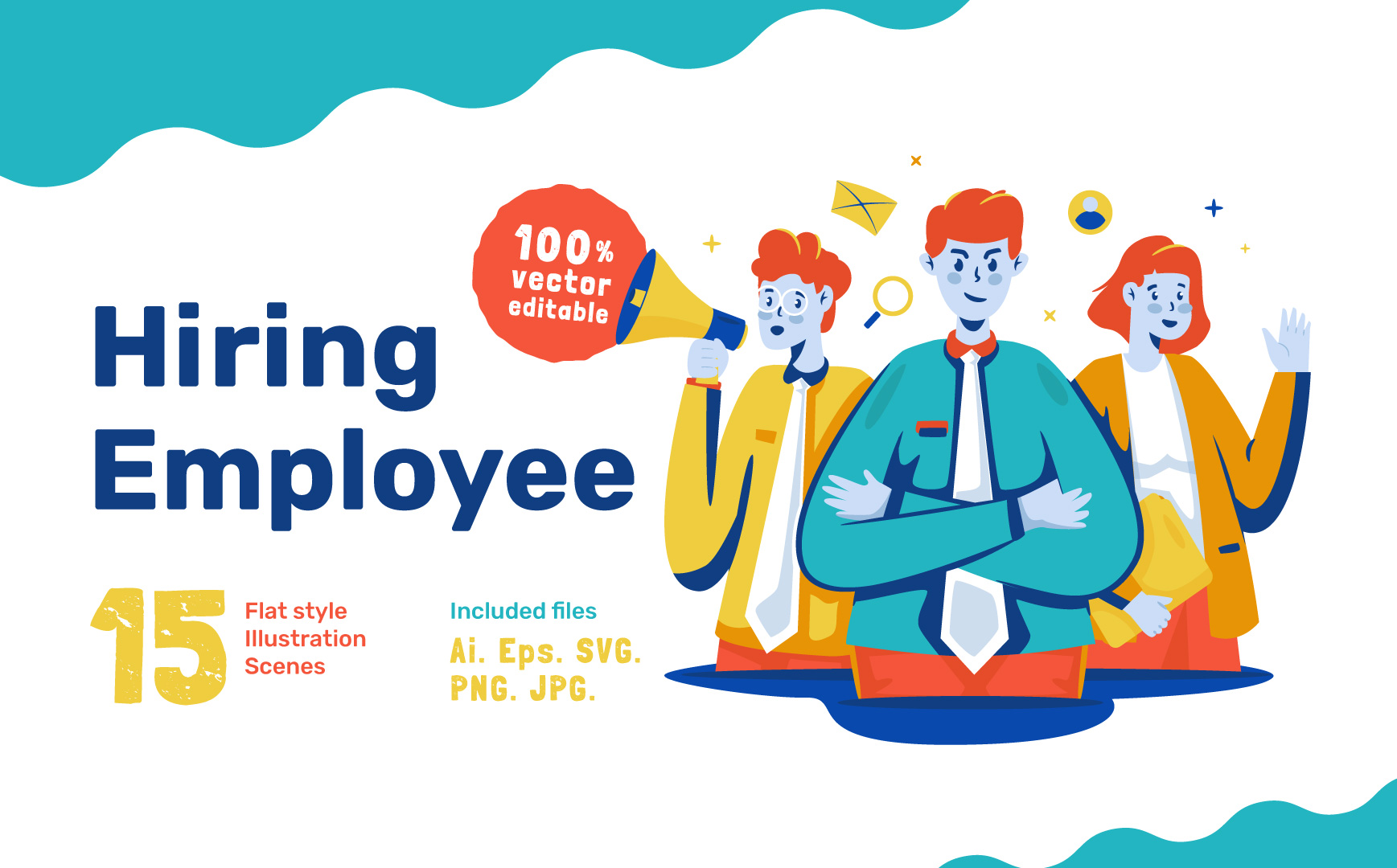 Introduce! Hiring employee vector illustration set. Fresh and colorful with vibrant colors. Use this illustration for elements on posters, banners, or other design media as your job vacancy design. Perfect for companies, agencies, or other businesses looking to open recruitment concept!