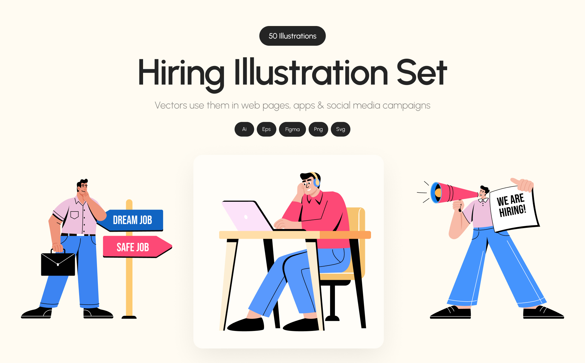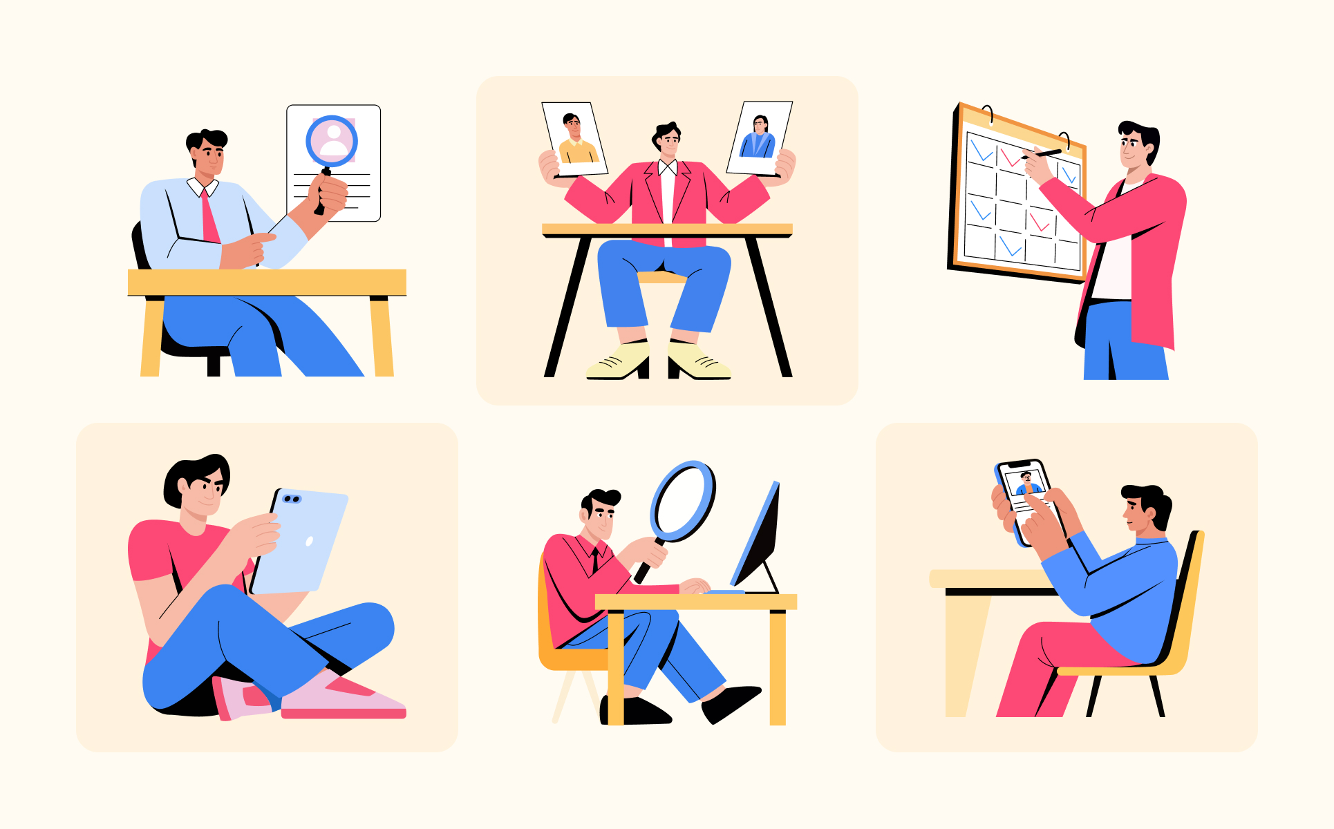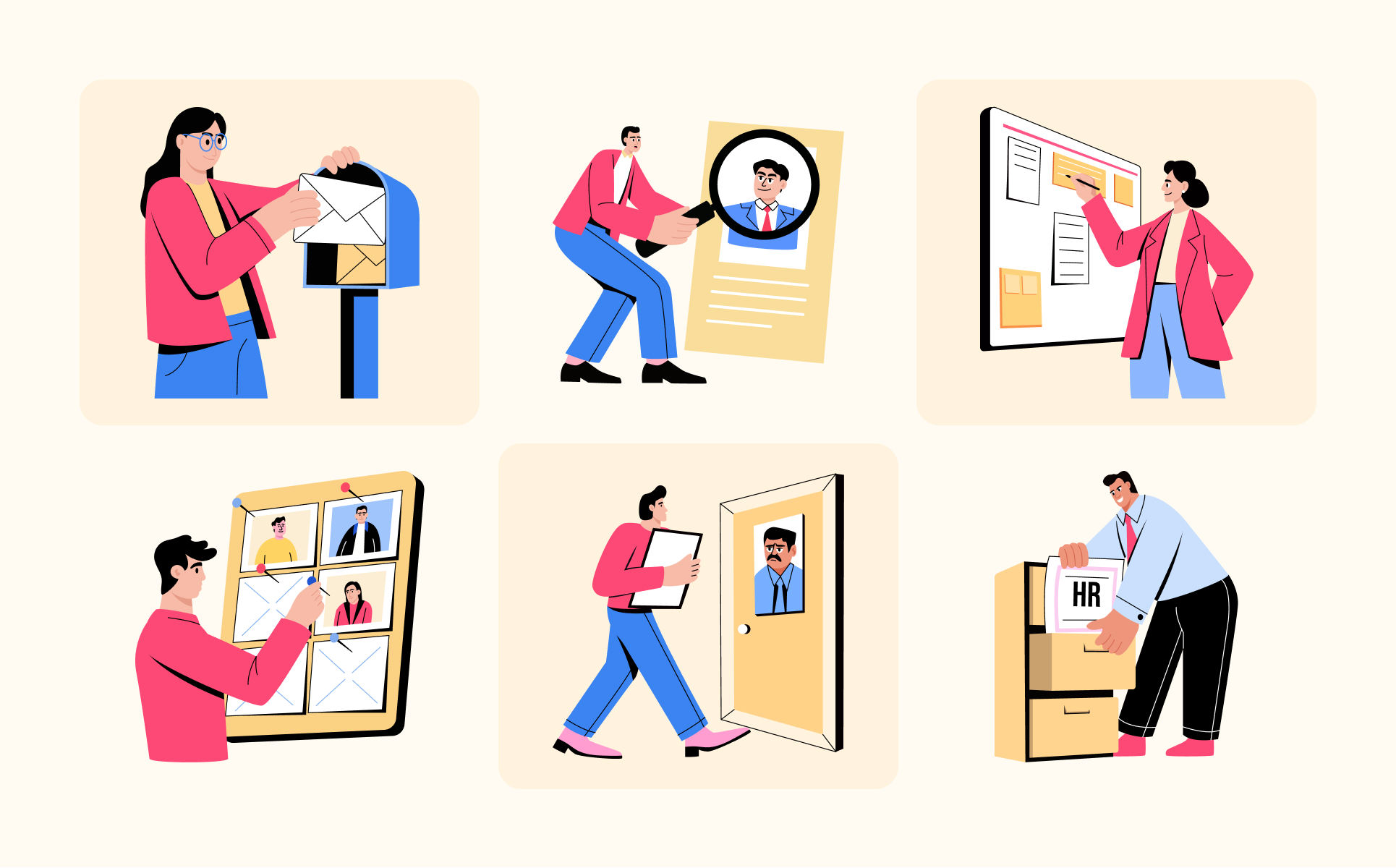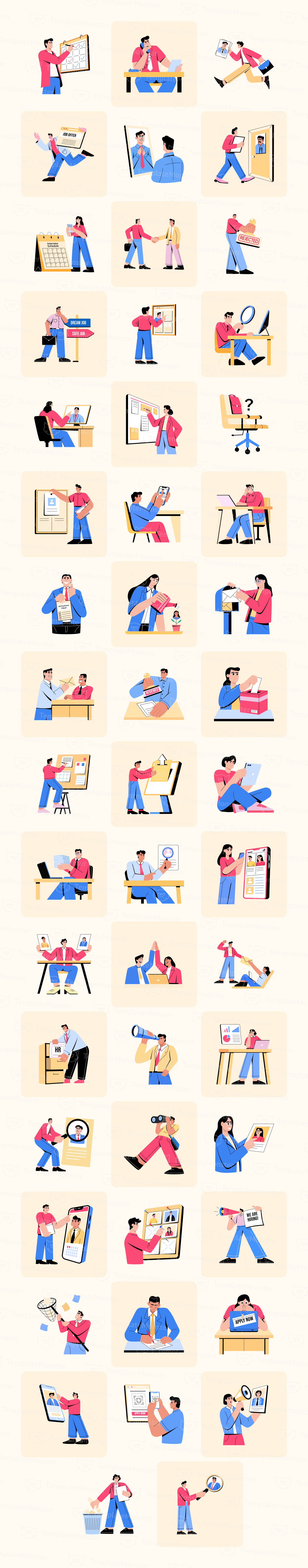 The hiring illustrations art set captures the entire journey of recruitment in a vibrant, engaging style. From interviews and remote meetings to hiring decisions and onboarding moments, each illustration is thoughtfully crafted to reflect the modern hiring experience. Whether you're building a career page, creating HR presentations, or designing recruitment content, this set adds a human touch that speaks to both creativity and professionalism.