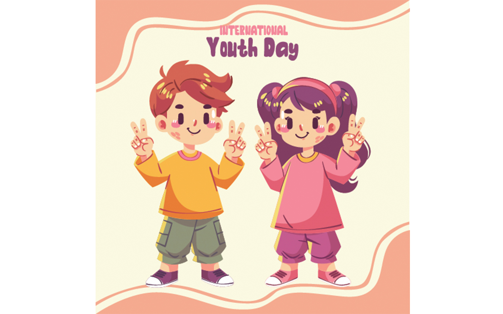 **This captivating illustration depicts two children joyfully making the peace sign with their hands, symbolizing unity and harmony. The vibrant colors and cheerful expressions of the children convey a message of hope and positivity, making it a perfect representation for International Youth Day Celebration. The image beautifully captures the spirit of youth coming together to promote peace and understanding, making it an ideal choice for commemorating this important occasion**