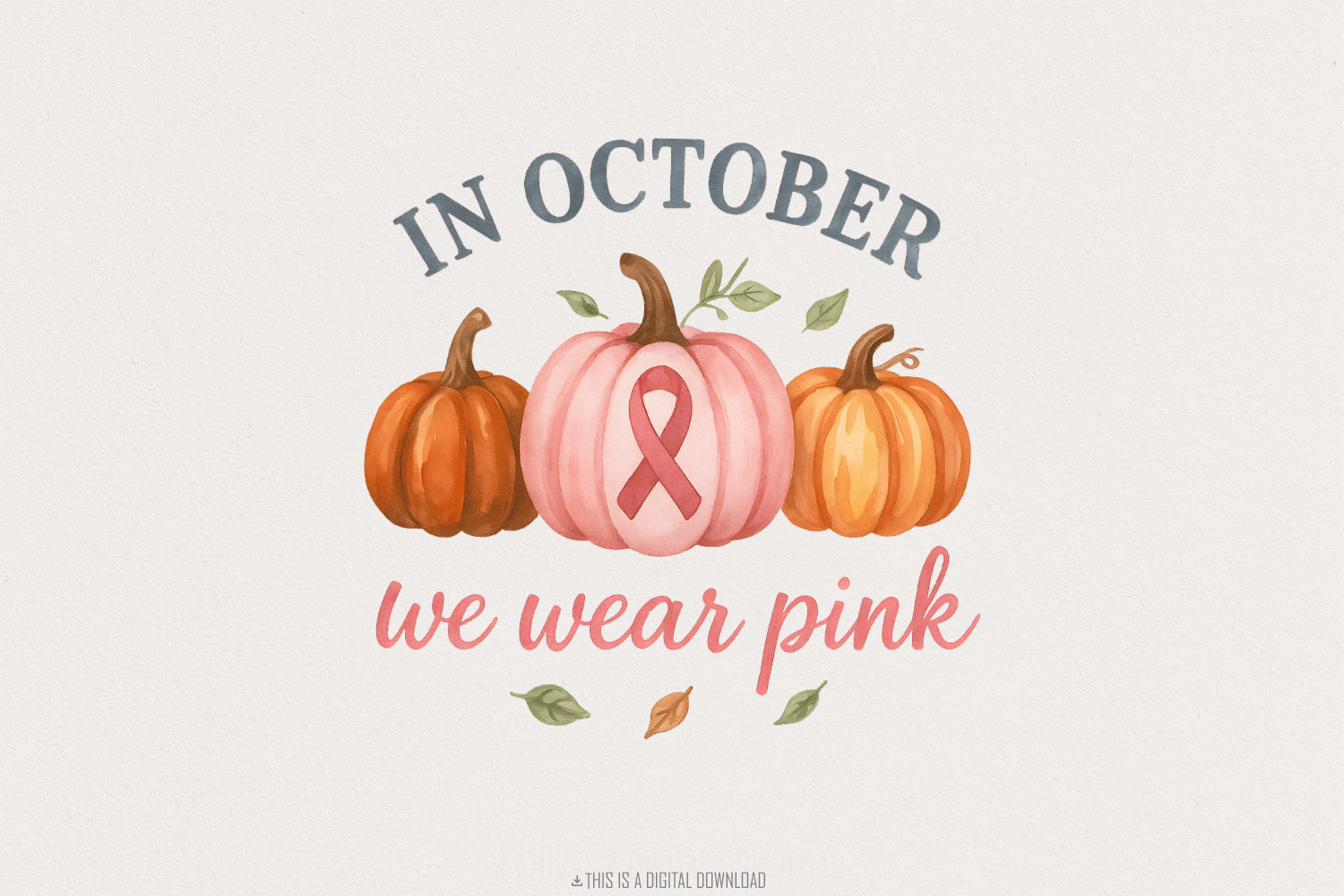 In October We Wear Pink PNG, Breast Cancer Awareness PNG, Pink Pumpkin PNG, Fall Halloween Autumn Illustration