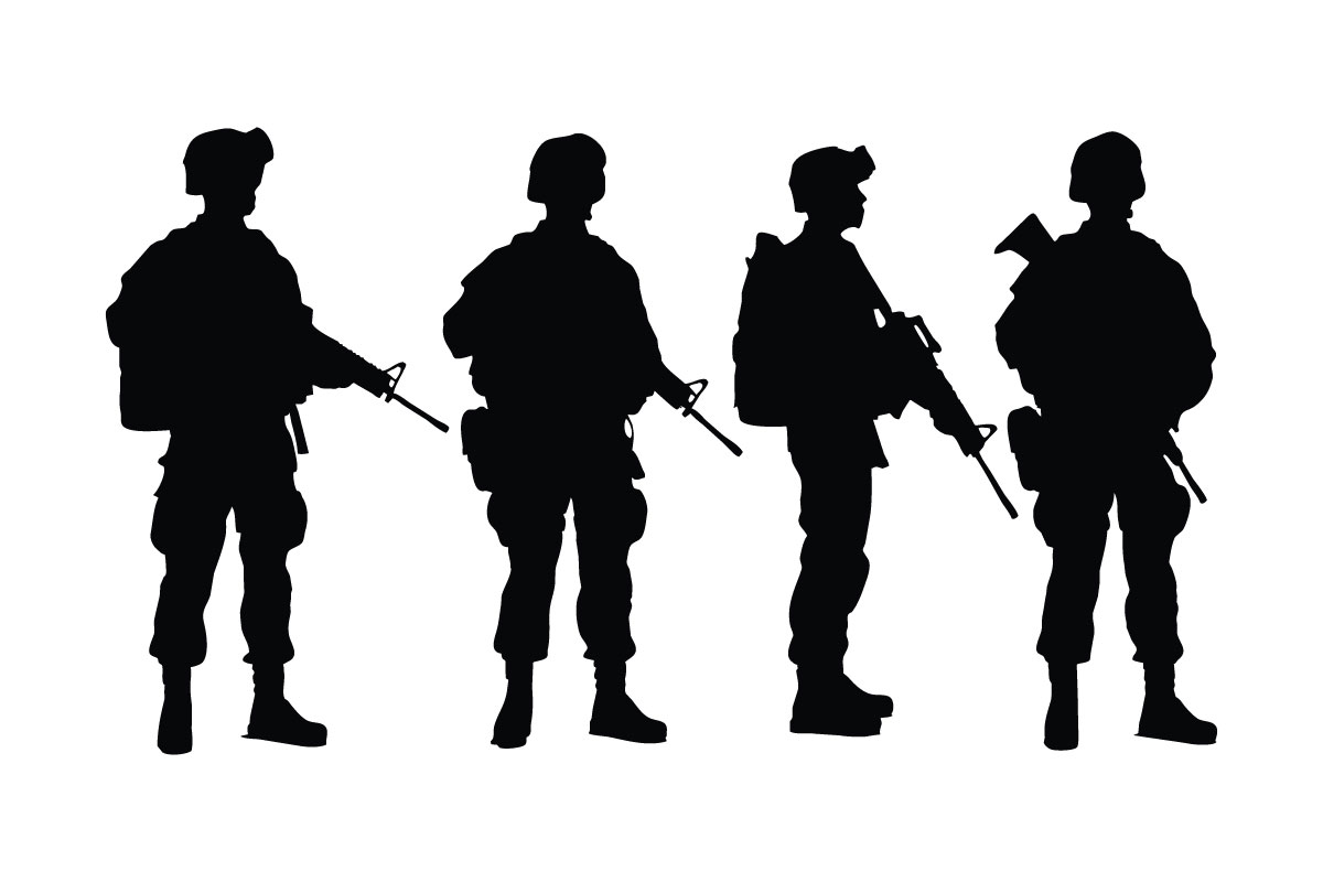 Infantry silhouette vector collection. Male armies silhouette on a white background. Army special units silhouette collection. Male soldiers wearing uniforms and with assault rifles silhouette bundles. Men infantry with anonymous faces.