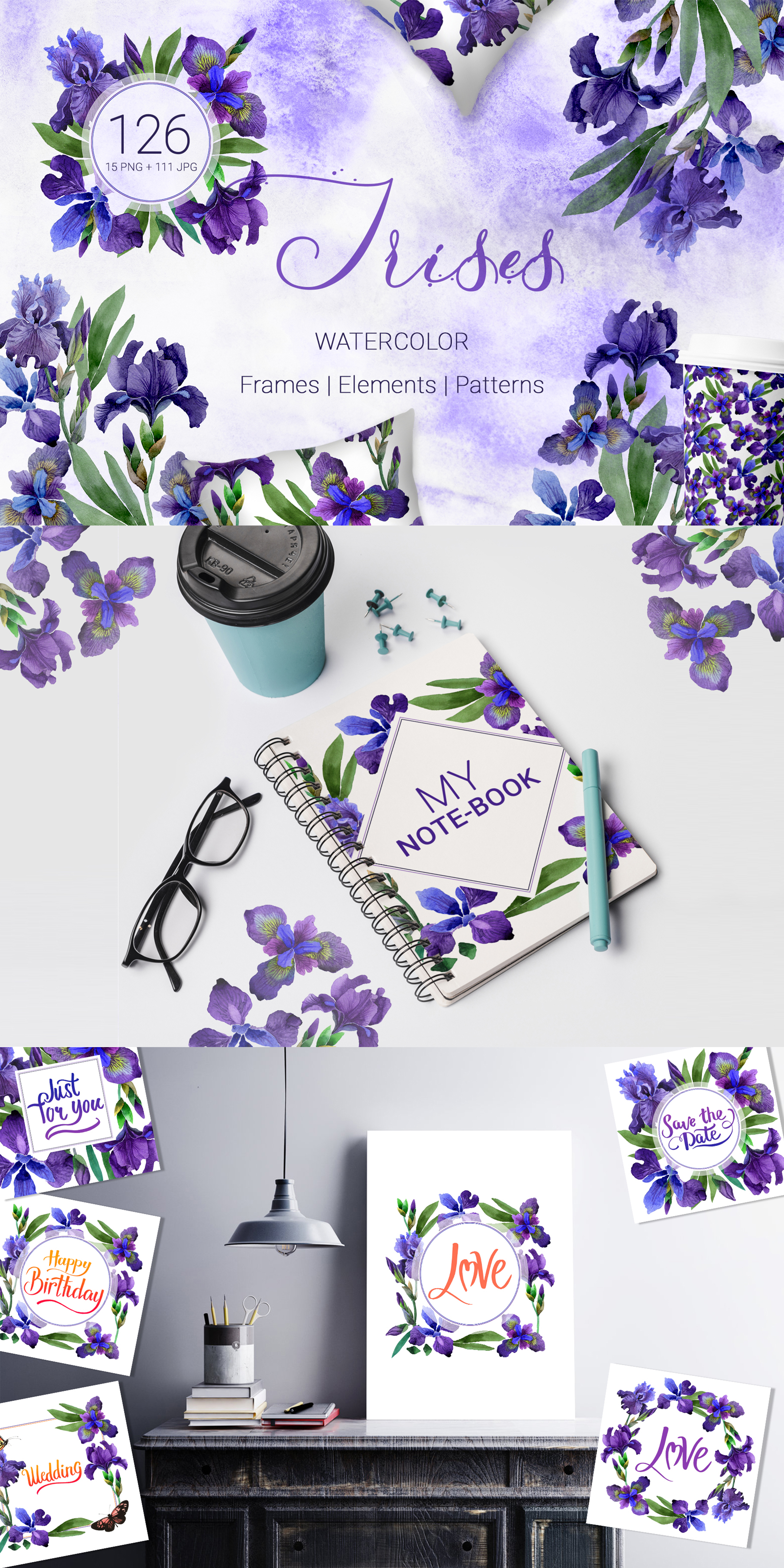 Irises Gentle Watercolor png clipart of 126 files. Ideal material for DIY, wedding invitations, greeting cards, quotes, blogs, posters and more.