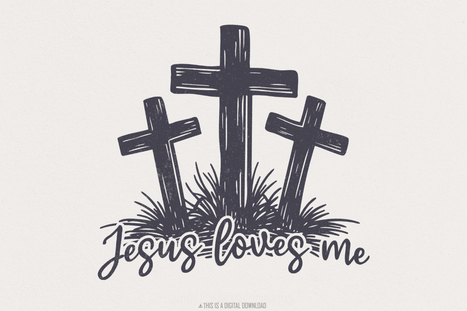 Jesus Loves Me PNG, Three Crosses Christian Sublimation Design, Bible Verse Faith Clipart, Illustration