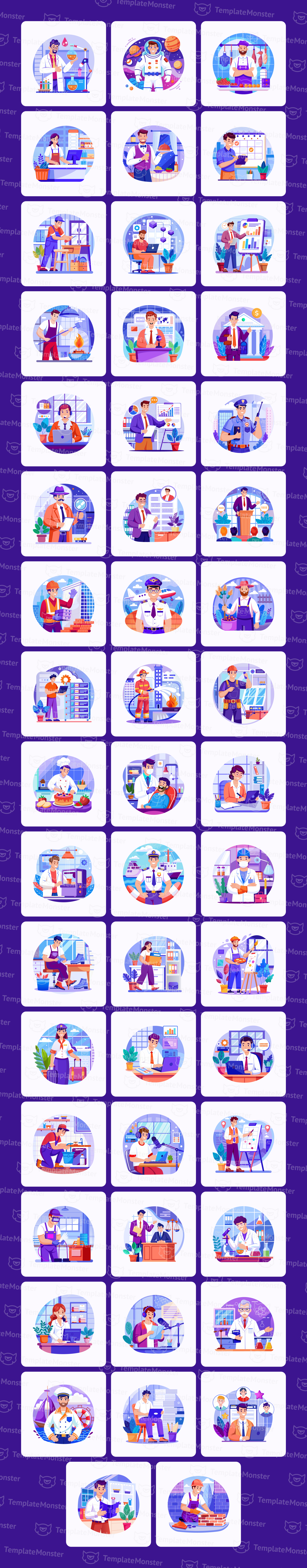 - Includes diverse job illustrations (doctors, teachers, engineers, and more)