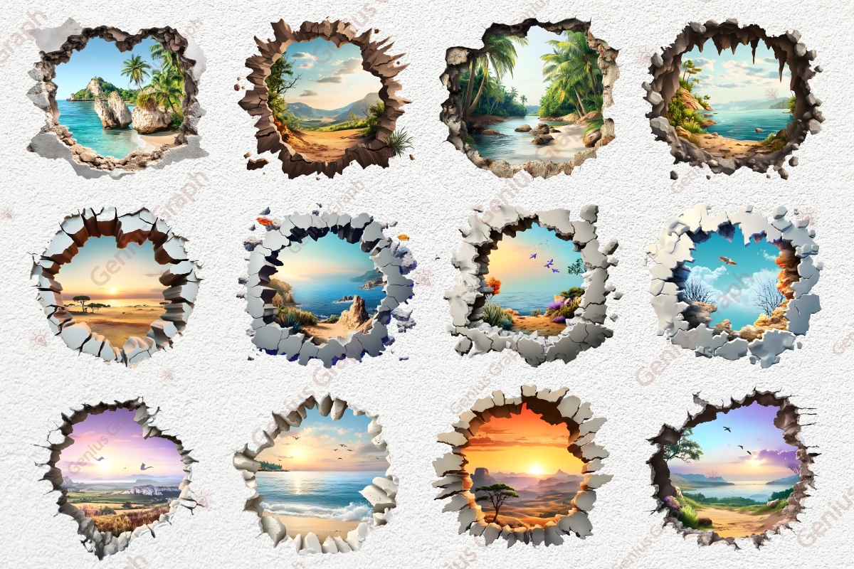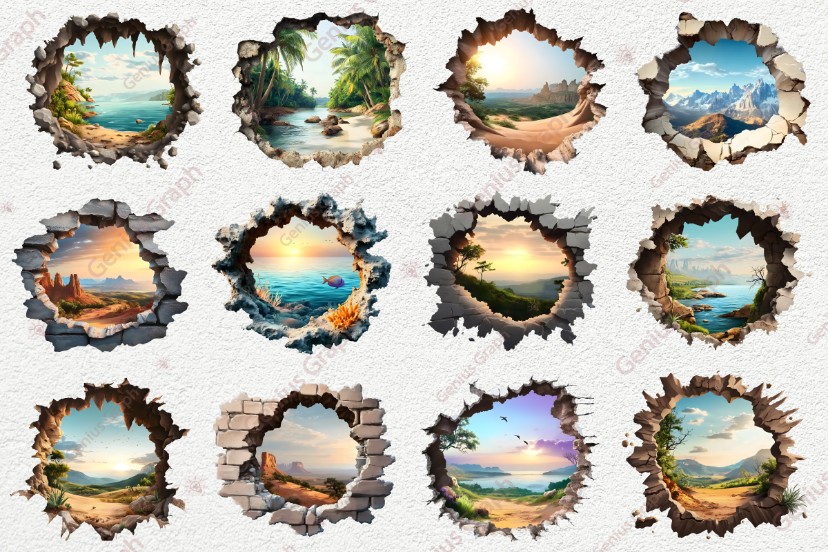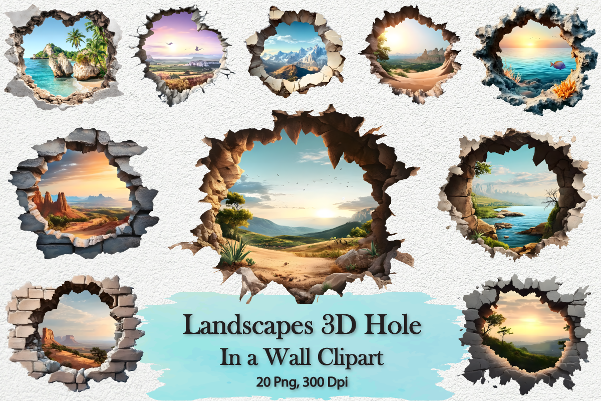 3D Hole in a Wall Clipart, 3D Landscapes Clipart, Landscapes 3D Hole In A Wall PNG Designs.