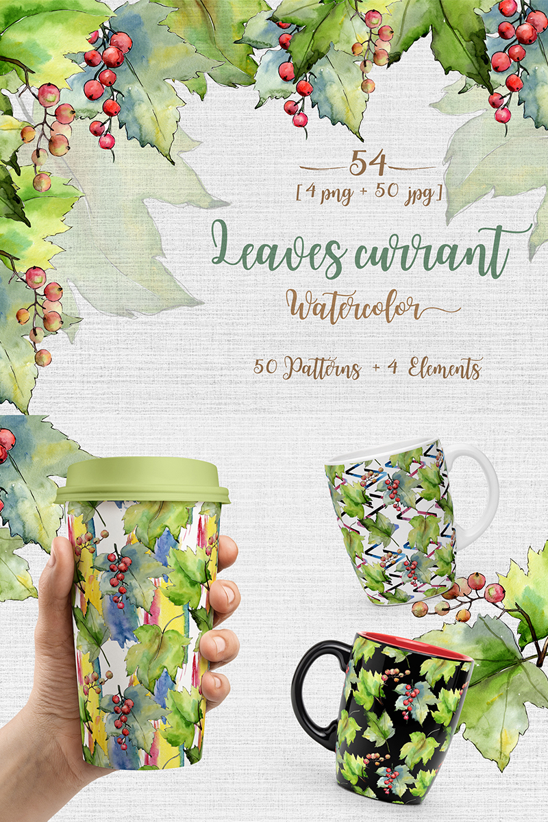 Leaves currant watercolor set of 54 files. Leaf plant botanical garden floral foliage. Ideal material for DIY, wedding invitations, greeting cards, quotes, blogs, posters and more.