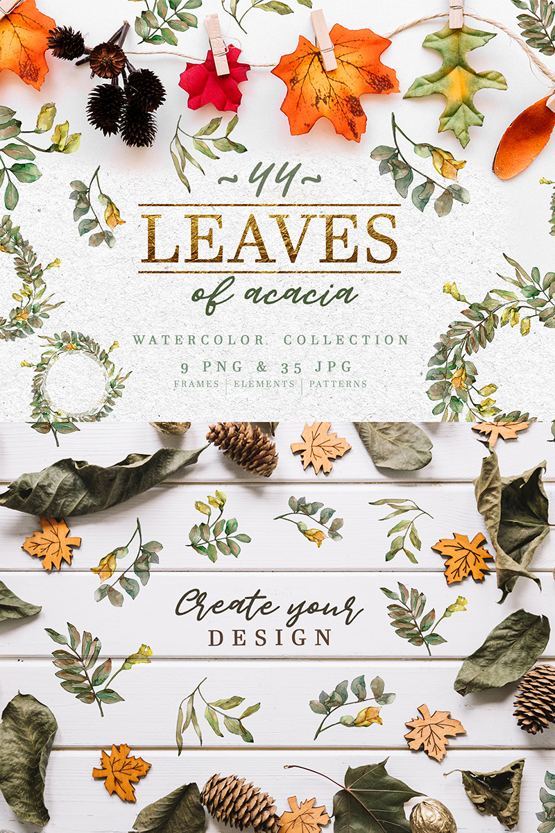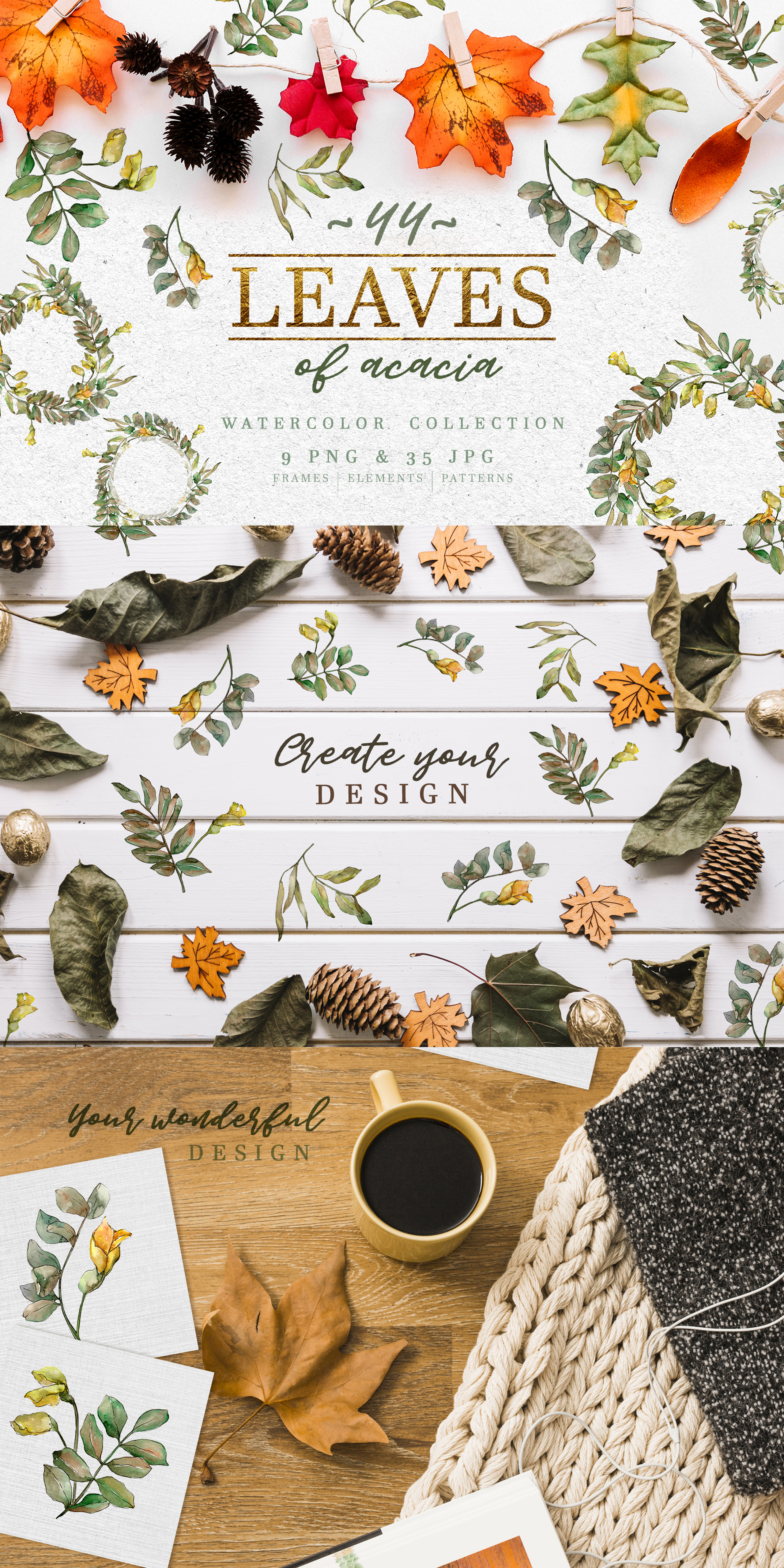 Leaves of acacia Watercolor png clipart of 44 files. Ideal material for DIY, wedding invitations, greeting cards, quotes, blogs, posters and more.