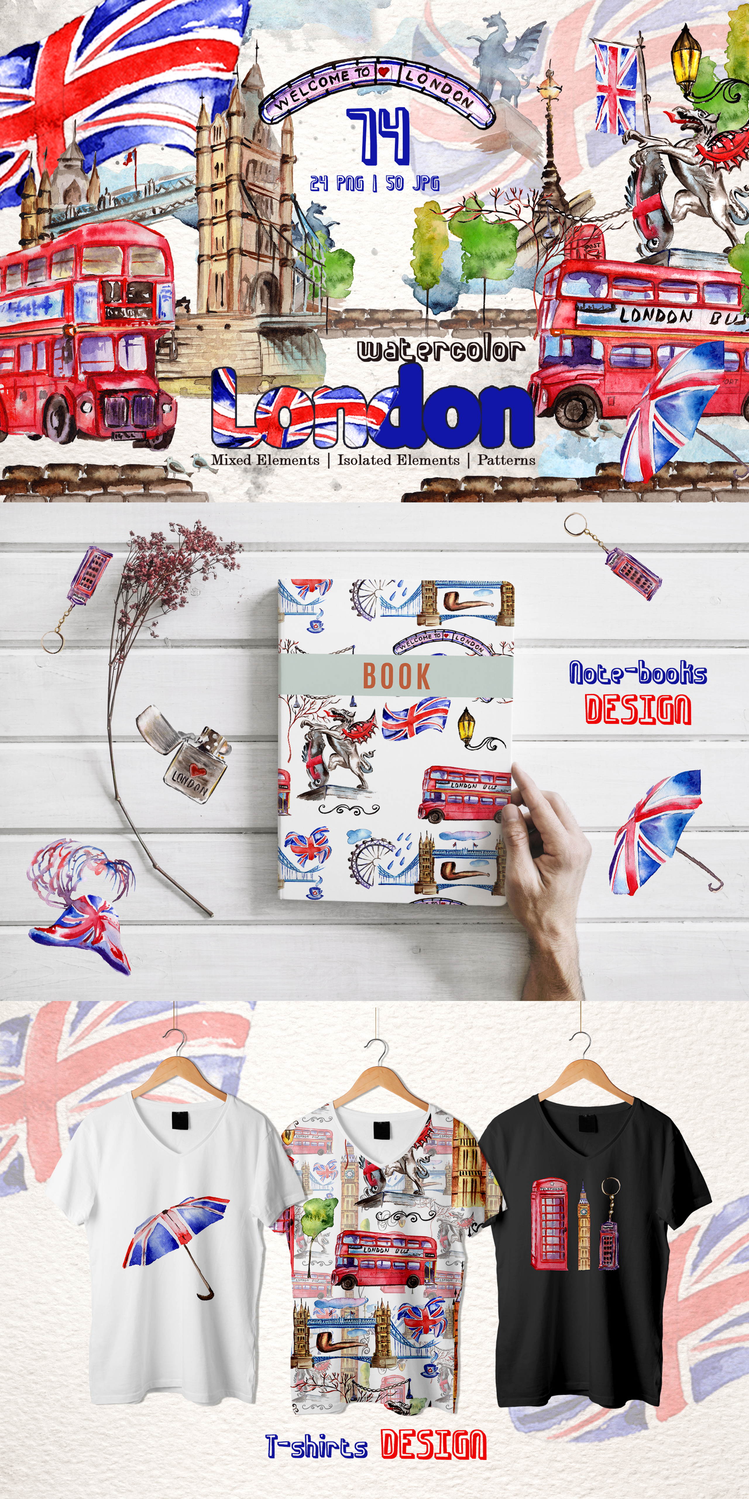 London Watercolor png clipart of 74 files. Ideal material for DIY, wedding invitations, greeting cards, quotes, blogs, posters and more.
