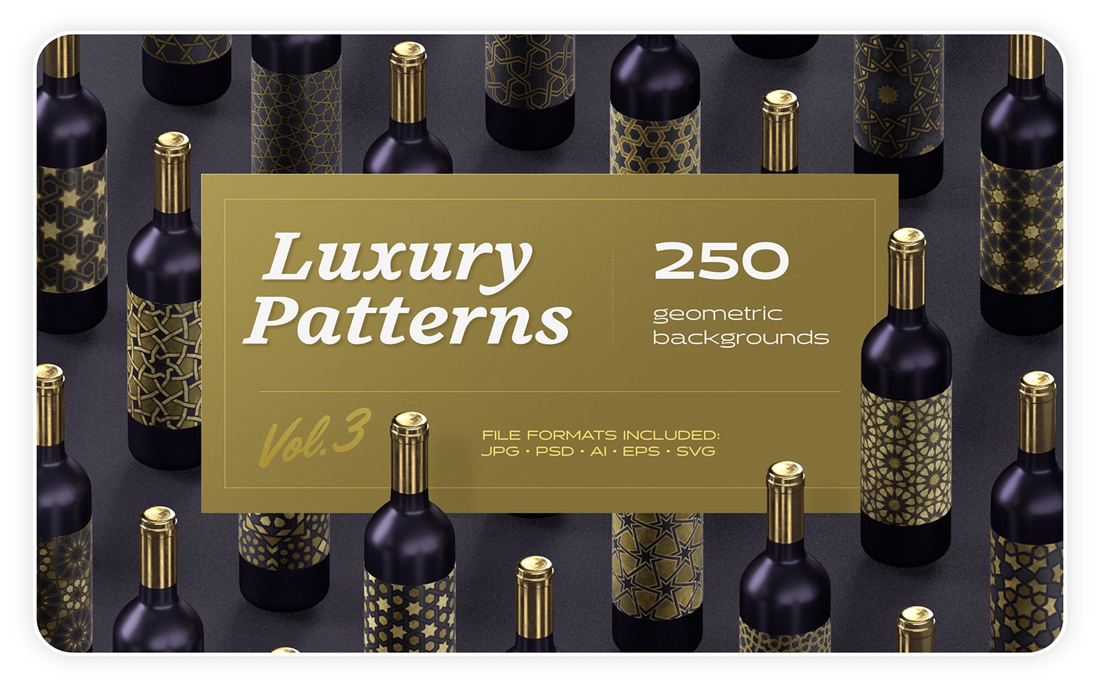 Luxury patterns is a collection of 250 high-resolution geometric backgrounds, inspired by the rich cultural heritage of Islamic Art. When transferred to packaging, stationery, cards, metal, wood, textile, these patterns make up the elaborate ornamentation.