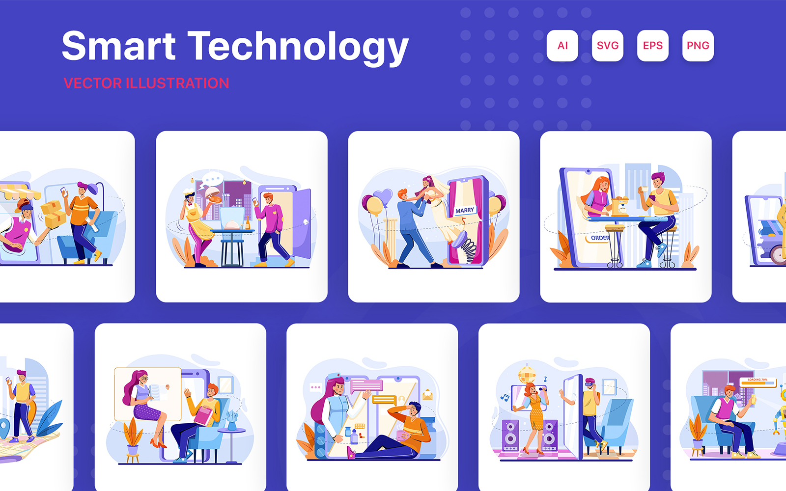 Can be easily resized and change colors of every shape as required. You could also combine different elements and create your own illustrations.