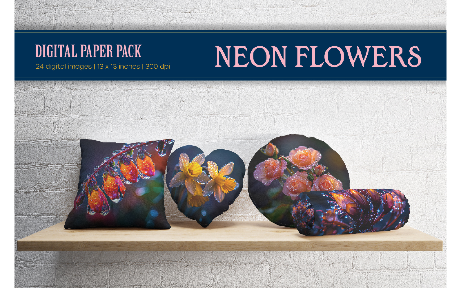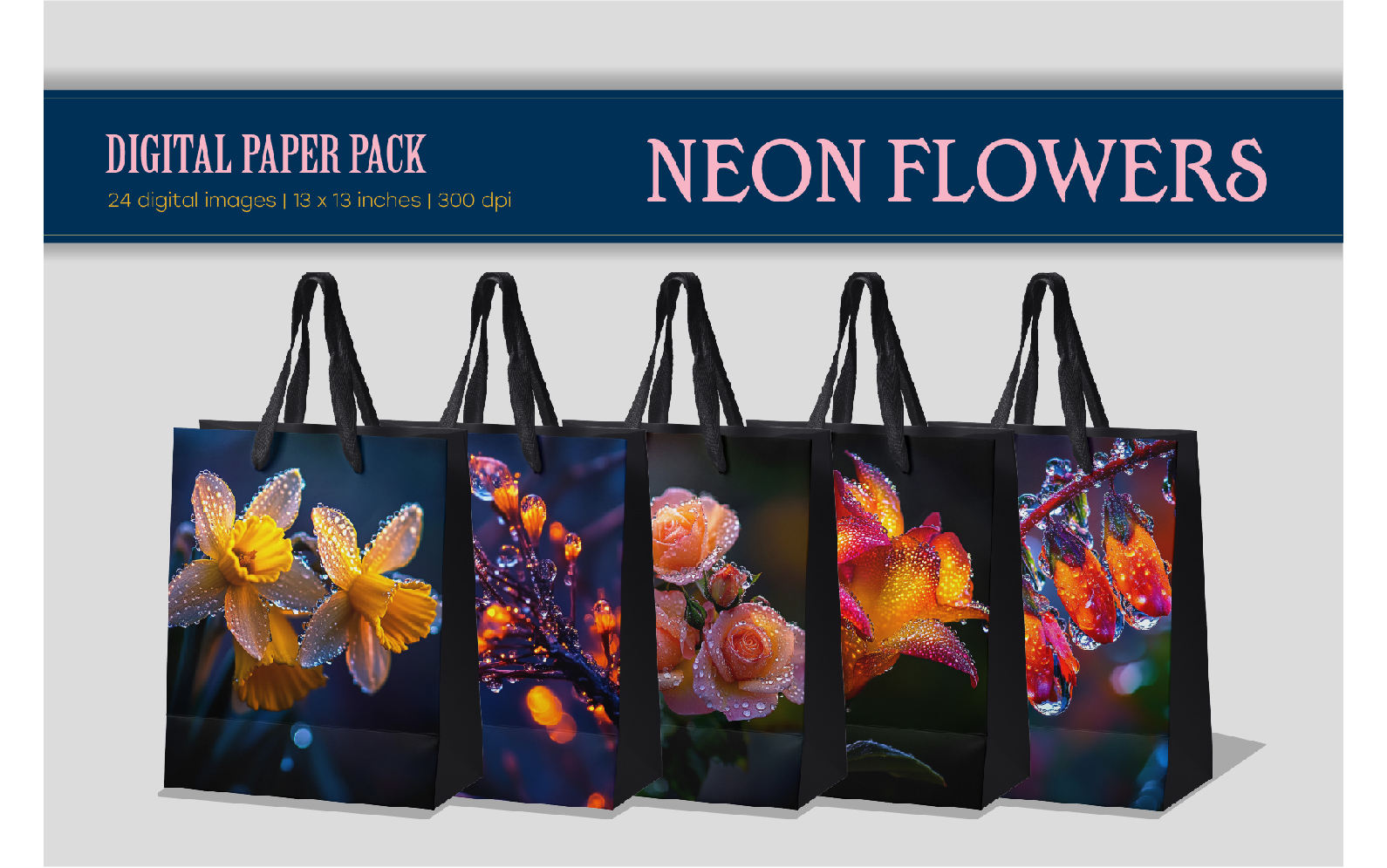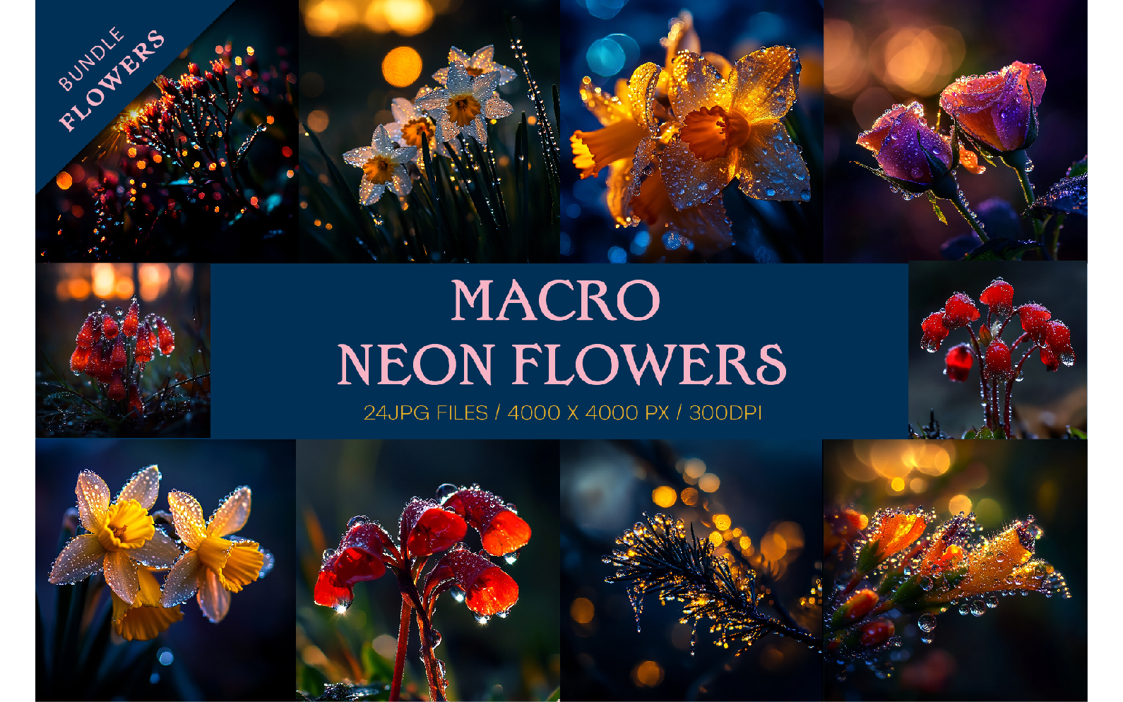 Collection of luxurious neon flowers, close-up with dew. These images are perfect for scrapbooking, decoupage, paper crafts, planner stickers, card and invitation designs, photo backdrops, printable, party decoration, product design, or any other creative project you can think of.