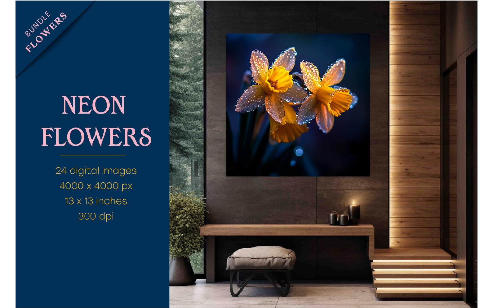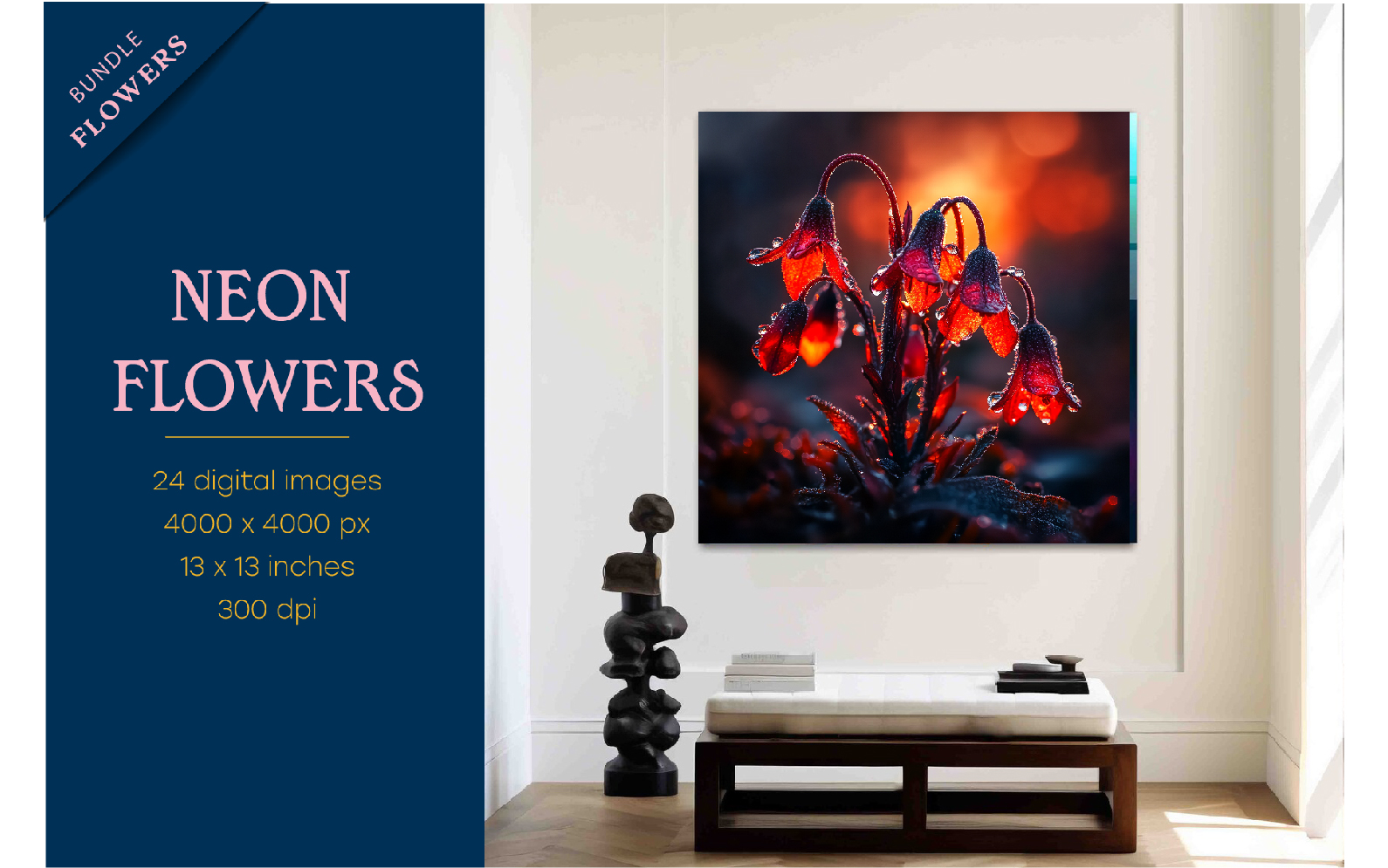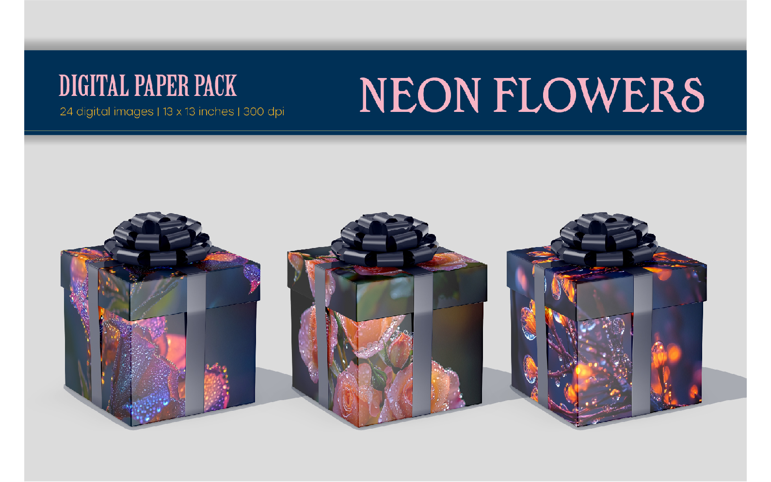 Collection of luxurious neon flowers, close-up with dew. These images are perfect for scrapbooking, decoupage, paper crafts, planner stickers, card and invitation designs, photo backdrops, printable, party decoration, product design, or any other creative project you can think of.