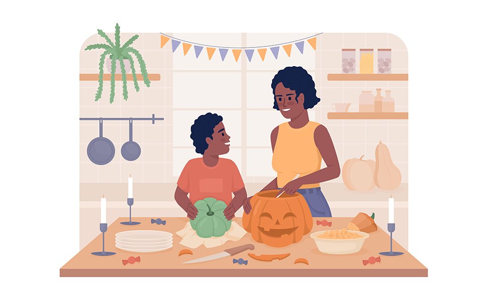 Making pumpkin lantern 2D vector isolated illustration. Mom and son interaction flat characters on cartoon background. Halloween preparation colourful editable scene for mobile, website, presentation .