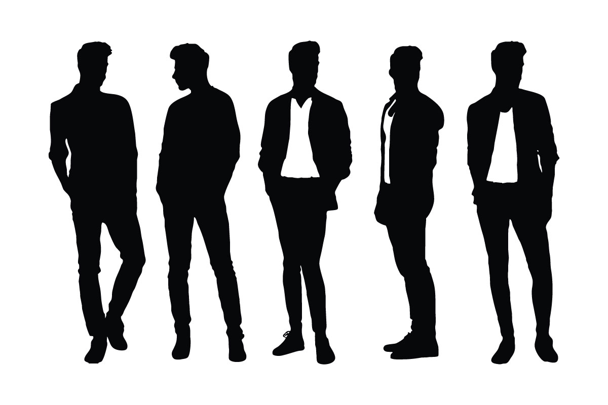 Male fashion model and actor standing. Male models and actors with anonymous faces. Fashion model boys silhouette collection. Male model silhouette on a white background. Actor men wearing stylish dresses and standing silhouette bundles.