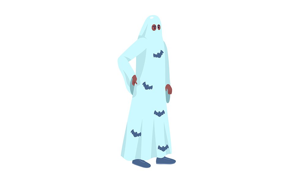 Man wearing ghost costume semi flat color vector character. Editable figure. Full body person on white. Halloween simple cartoon style illustration for web graphic design and animation
